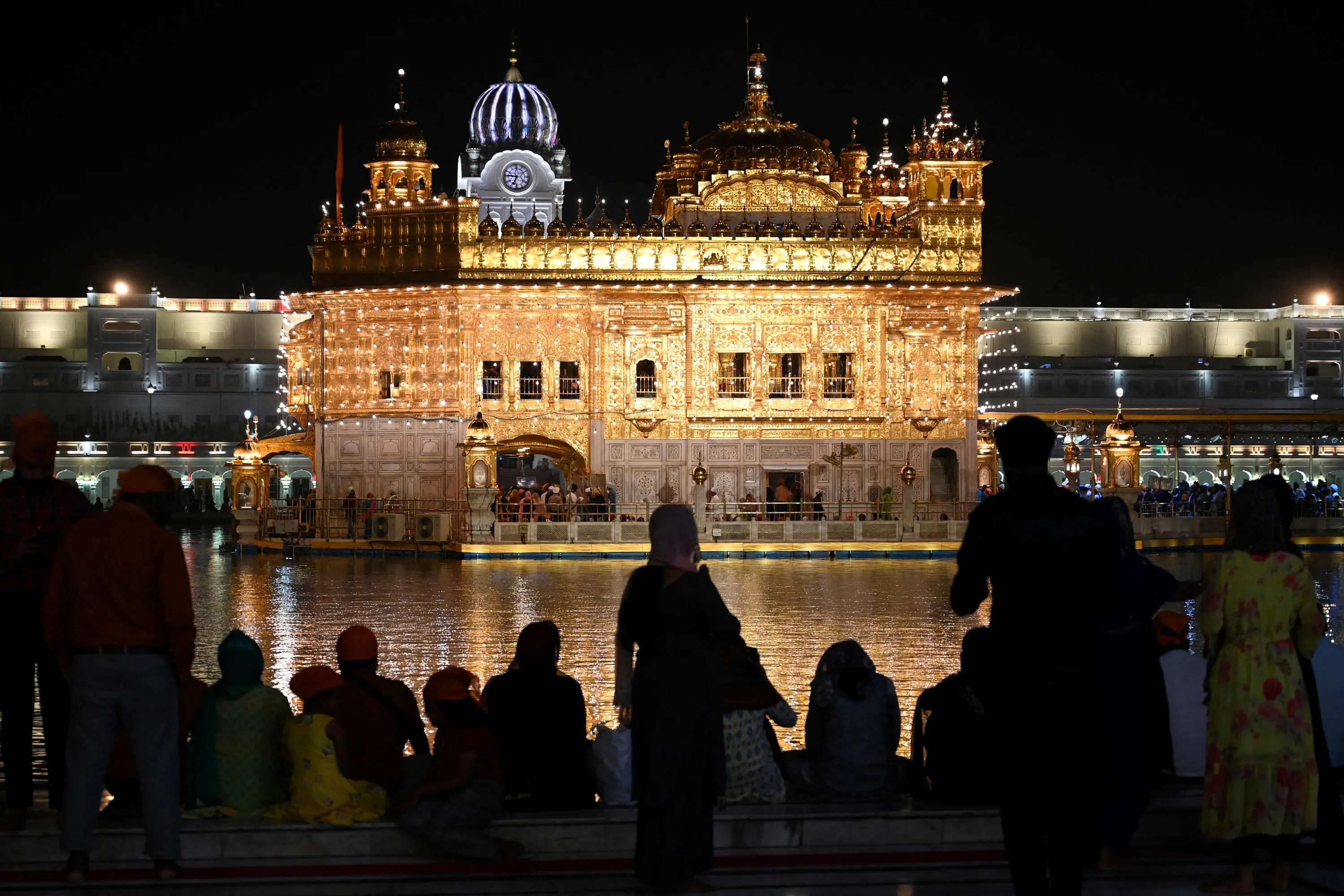 Devotees visit the illuminated Golden Temple on the eve of the birth anniversary of Guru Nanak Dev, the founder of Sikhism, in Amritsar on November 7, 2022. (Photo by Narinder Nanu/AFP Photo)
