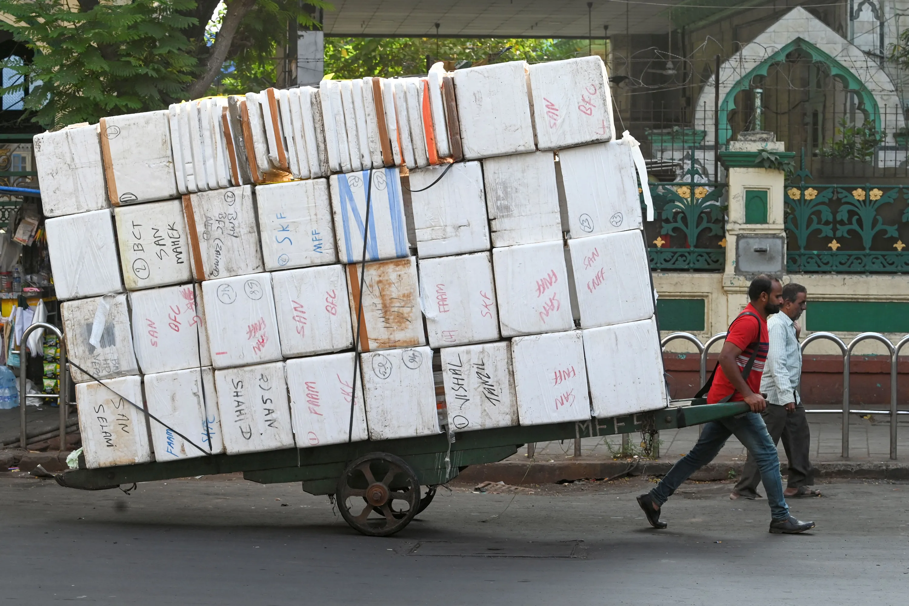 A man pulls a handcart loaded with polystyrene boxes to load fish from a market in Mumbai on November 16, 2022 (Photo by Indranil Mukherjee/AFP Photo)