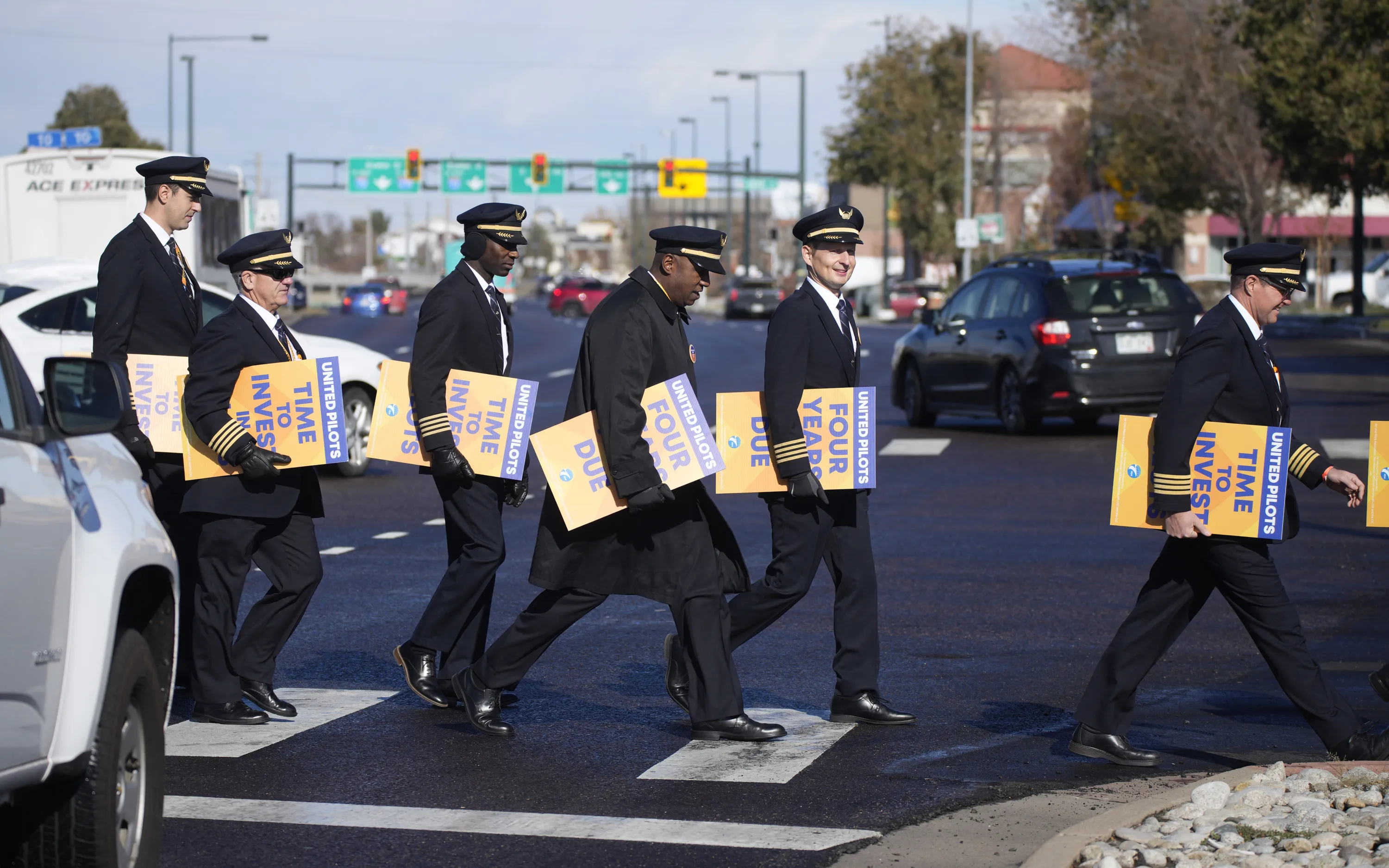 United Airlines pilots as well as other supporters cross Quebec Street to walk an informational picket line to signify the pilot union's commitment to attain an industry-leading contract on Tuesday, November 15, 2022, outside the United Airlines flight training center in east Denver. Organizers said that more than 500 pilots took part in the picket line, which was staged due to management delays during contract negotiations. (Photo by David Zalubowski/AP Photo)