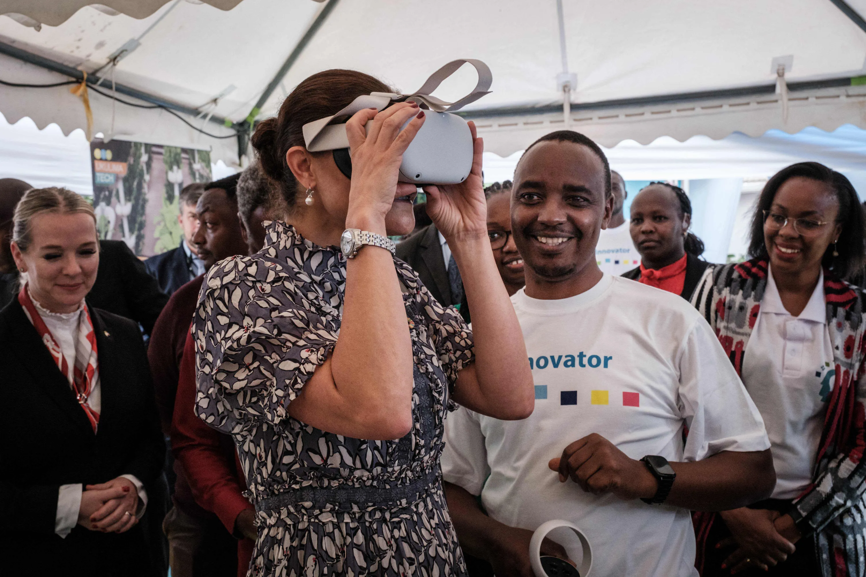 Crown Princess Victoria of Sweden (L) puts on a headset to watch virtual reality contents for schools created by Kenyan startup Cresnet at Adanian Labs, Kenya's startup hub, in Nairobi on November 22, 2022. (Photo by Yasuyoshi Chiba/AFP Photo)