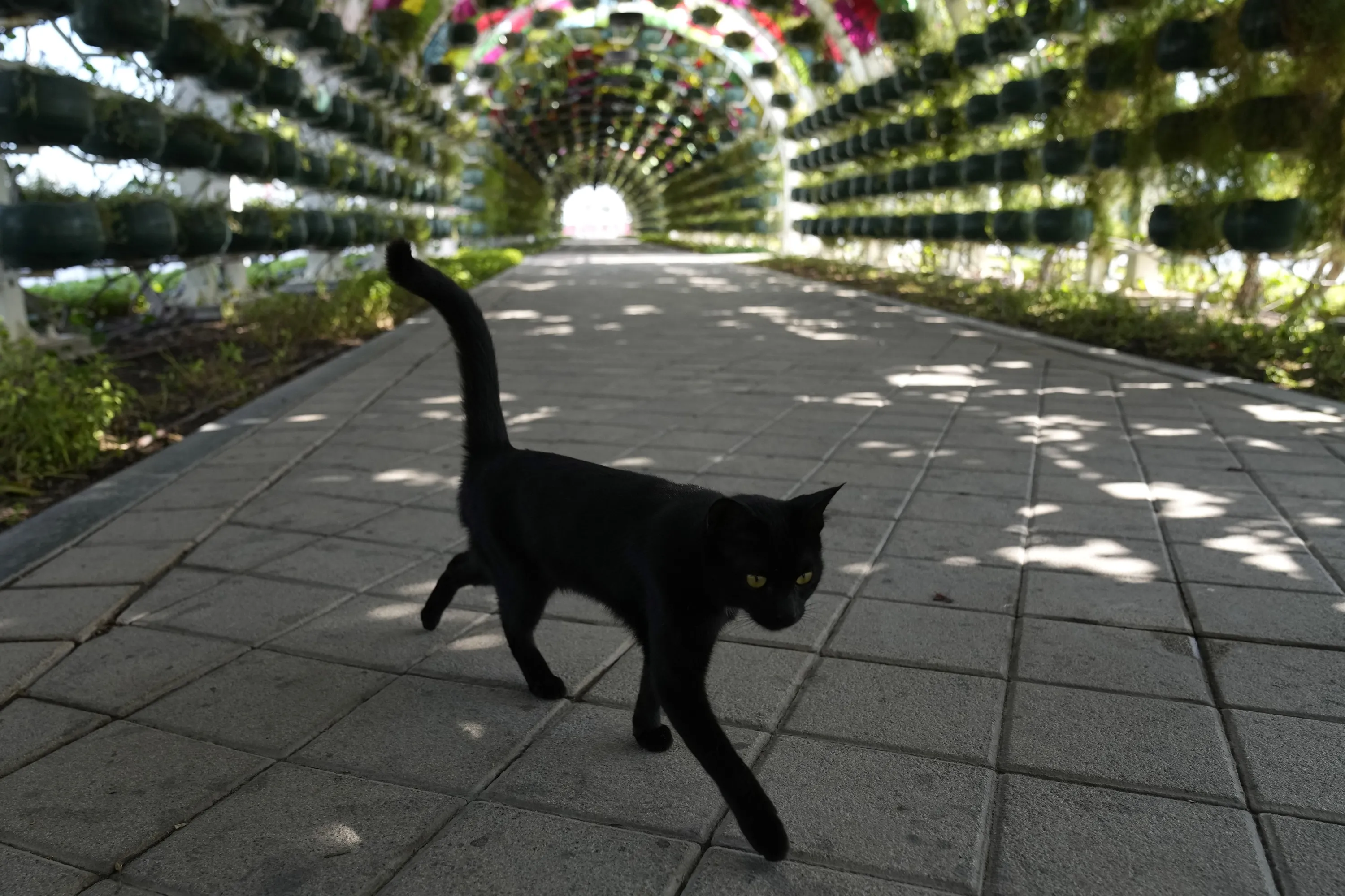 A black cat walks along a garden outside the FIFA Fan Festival in Doha, Qatar, Tuesday, November 22, 2022. (Photo by Abbie Parr/AP Photo)