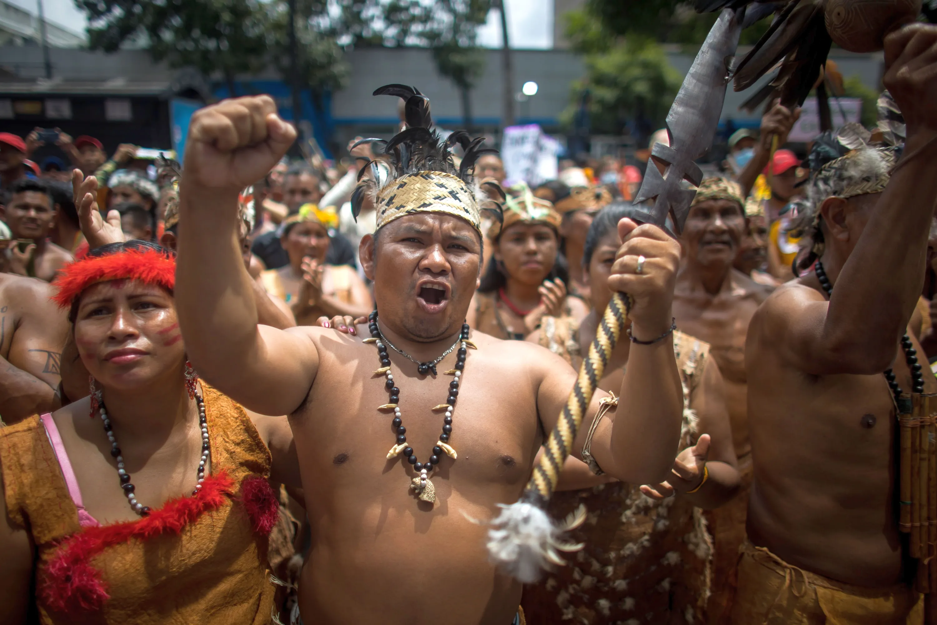 A group of people participate in a pro-government demonstration on the Day of Indigenous Resistance in Caracas, Venezuela, 12 October 2022. At least 200 Venezuelans belonging to indigenous communities marched this Wednesday in eastern Caracas to commemorate the Day of Indigenous Resistance and in rejection of the “criminal blockade”, referring to the sanctions implemented by the United States and the European Union (EU) against Venezuela. (Photo by Miguel Gutierrez/EPA/EFE)
