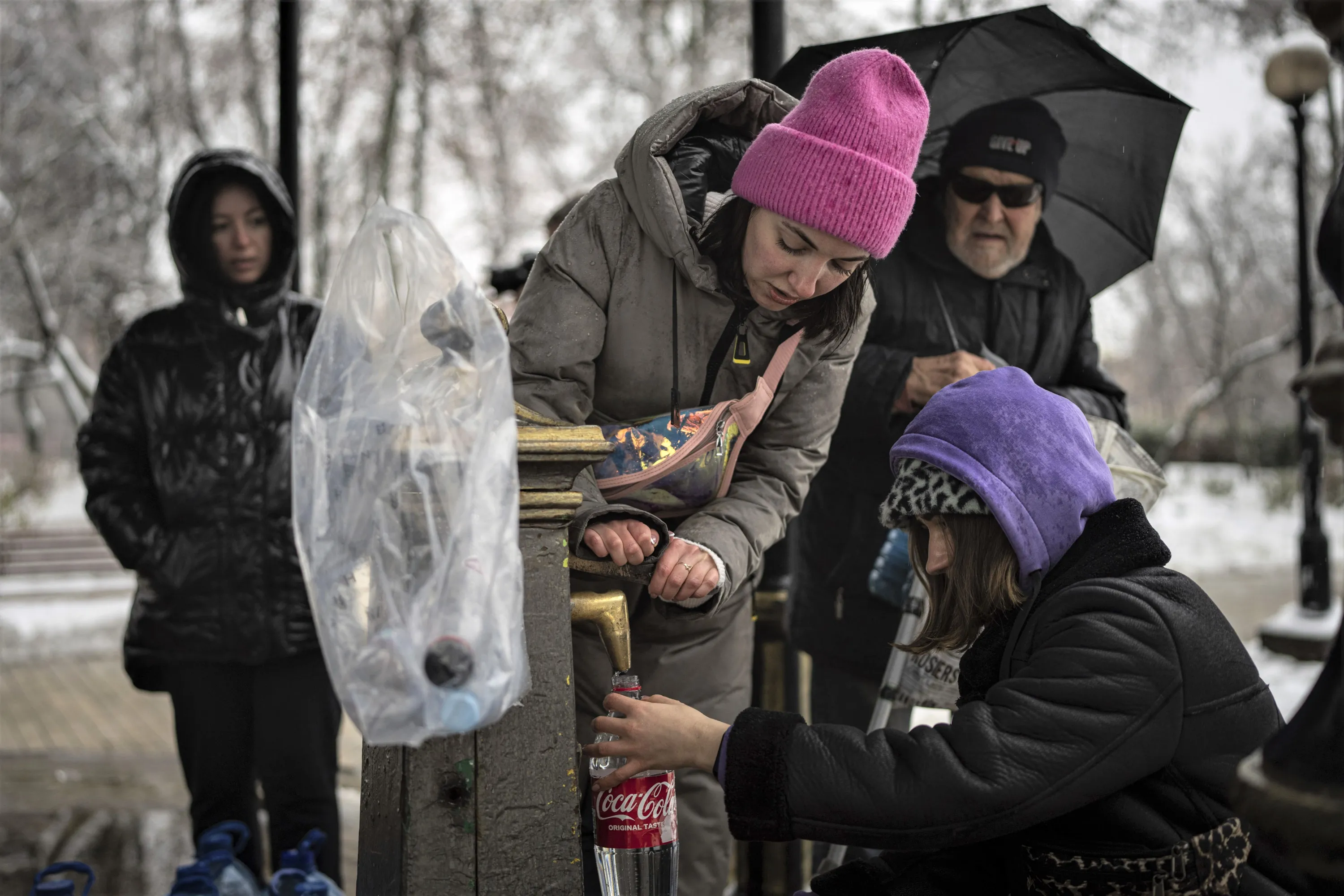 People collect water, in Kyiv, Ukraine, Thursday, November 24, 2022. (Photo by Evgeniy Maloletka/AP Photo)