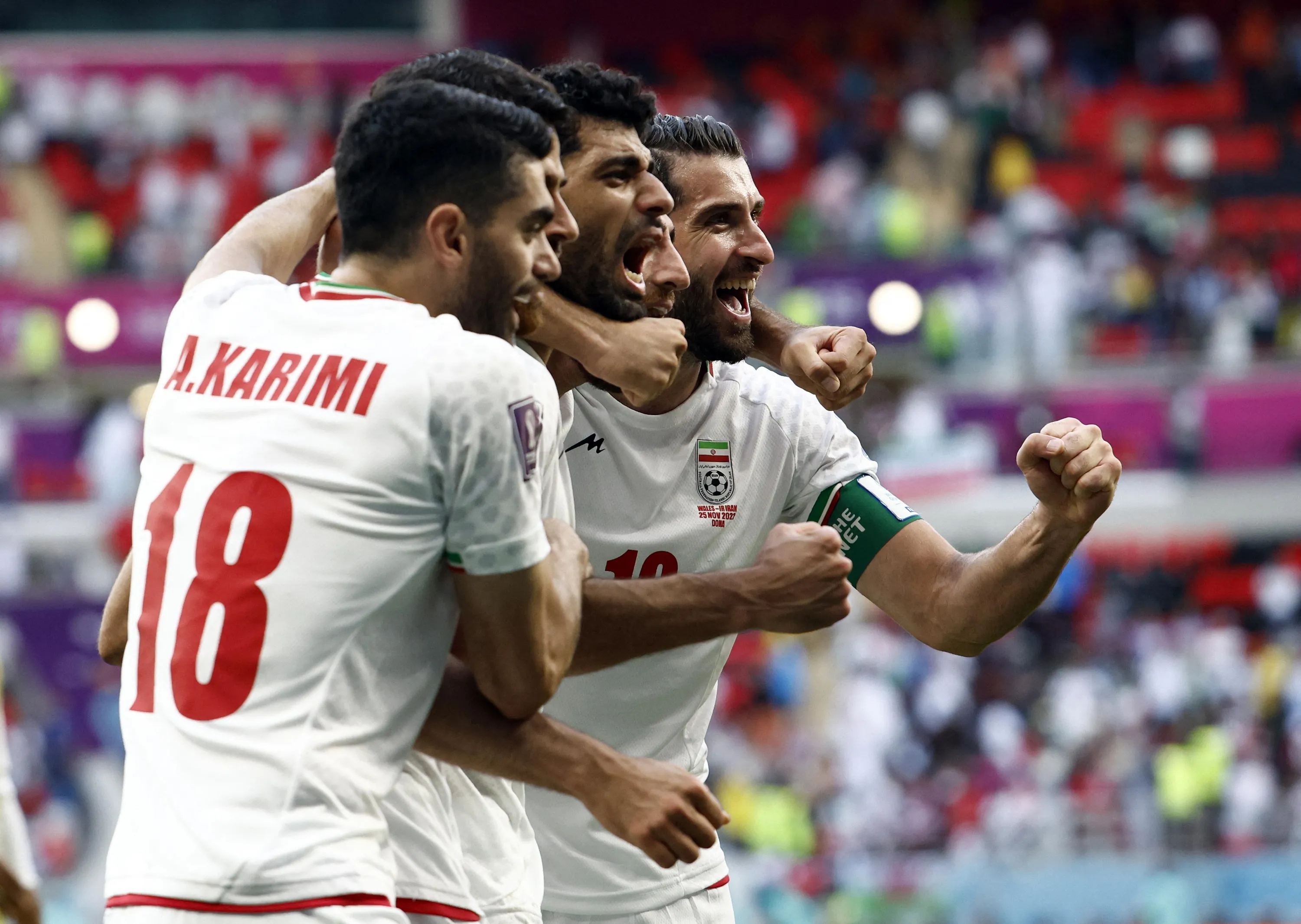 Iran's Karim Ansarifard and teammates celebrating the victroy during the World Cup match between Wales v Iran at the Ahmad Bin Ali Stadium on November 25, 2022 in Al Rayyan, Qatar. (Photo by Amanda Perobelli/Reuters)