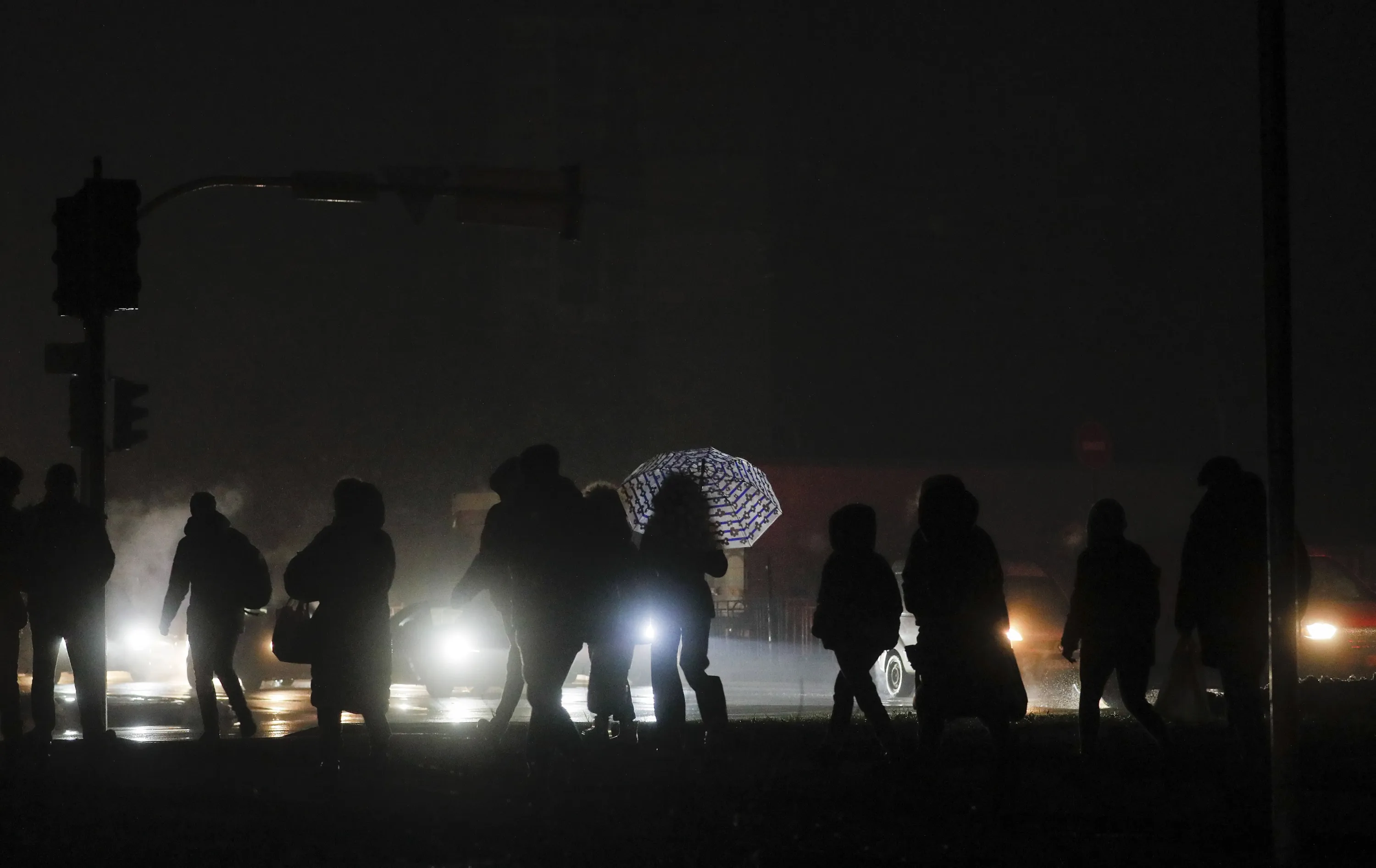 People cross a dark street in Kyiv, Ukraine, 24 November 2022, amid the Russian invasion. The water supply is restored already but about 70 percent of residential buildings stay without electricity after yesterday's shelling, as Kyiv city military administration reports. Russia carried out a massive rocket attack against critical infrastructure in several areas of Ukraine on November 23. Russian troops entered Ukraine on 24 February 2022 starting a conflict that has provoked destruction and a humanitarian crisis. (Photo by Sergey Dolzhenko/EPA/EFE)