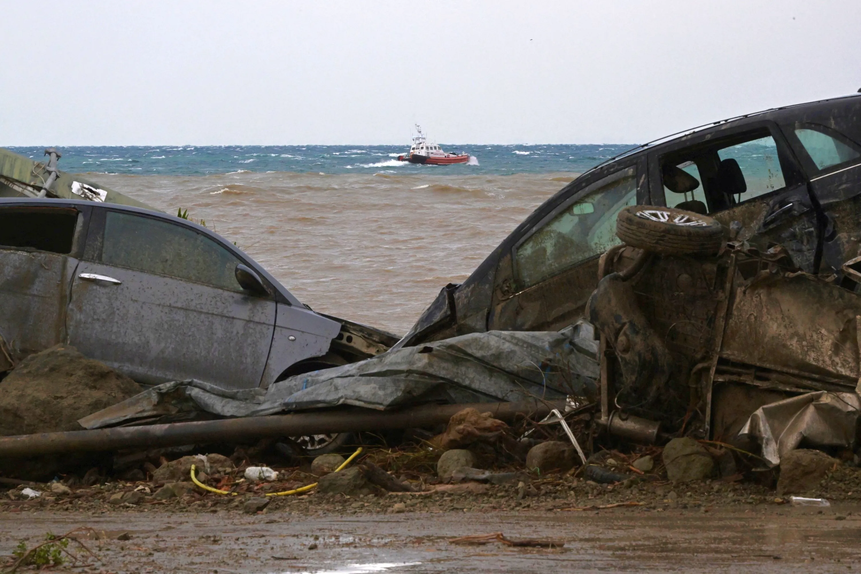 Damaged cars are seen in the sea in the southern Ischia island on November 26, 2022, following heavy rains that sparked a landslide. Italy's interior minister said there had been no confirmed deaths in a landslide on November 26, 2022 on the island of Ischia, despite earlier reports of eight killed.. (Photo by ANSA via AFP Photo)