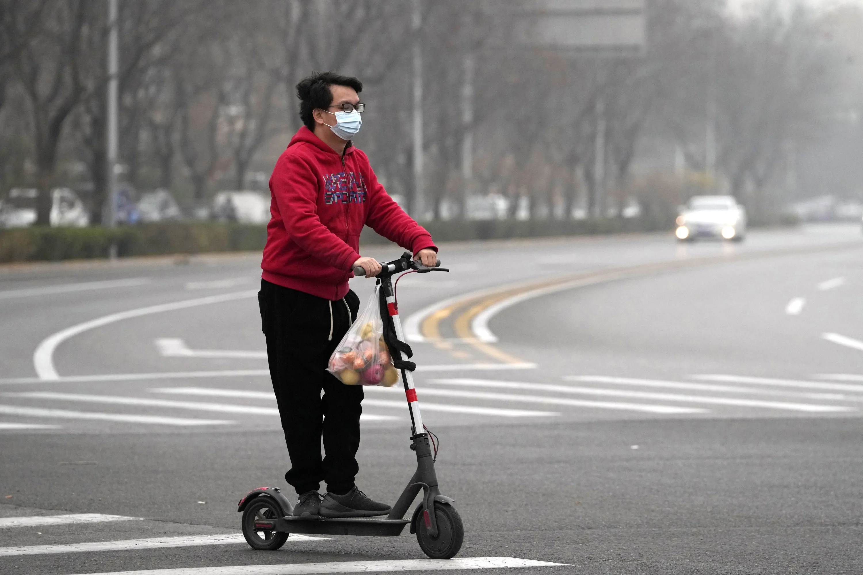 A resident rides a scooter along a quiet street in a district as restaurants are shut and residents encouraged to stay in their vicinity in Beijing, Thursday, November 24, 2022. (Photo by Ng Han Guan/AP Photo)