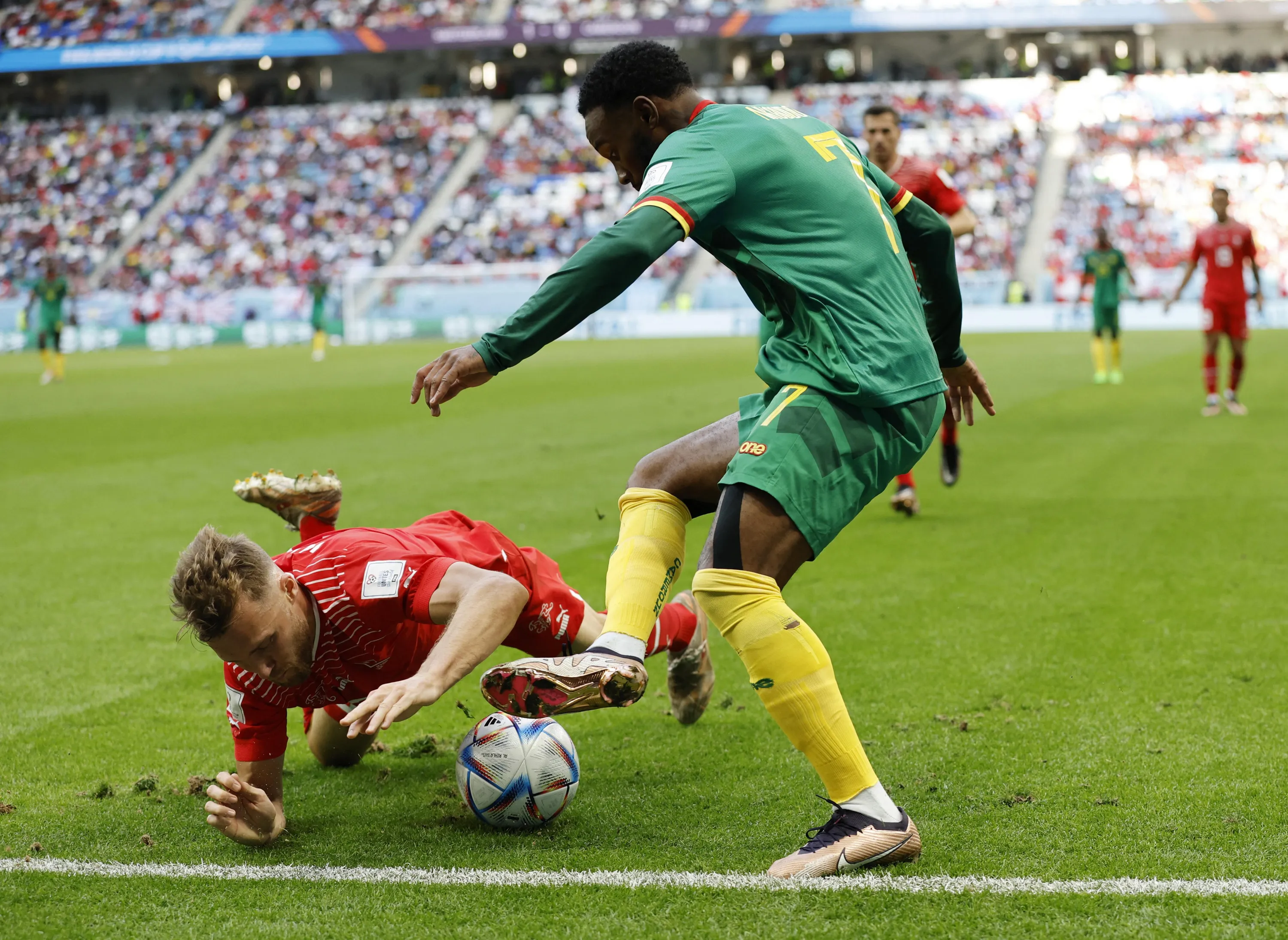 Georges-Kevin Nkoudou of Cameroon controls the ball against Silvan Widmer of Switzerland during the FIFA World Cup Qatar 2022 Group G match between Switzerland and Cameroon at Al Janoub Stadium on November 24, 2022 in Al Wakrah, Qatar. (Photo by Issei Kato/Reuters)