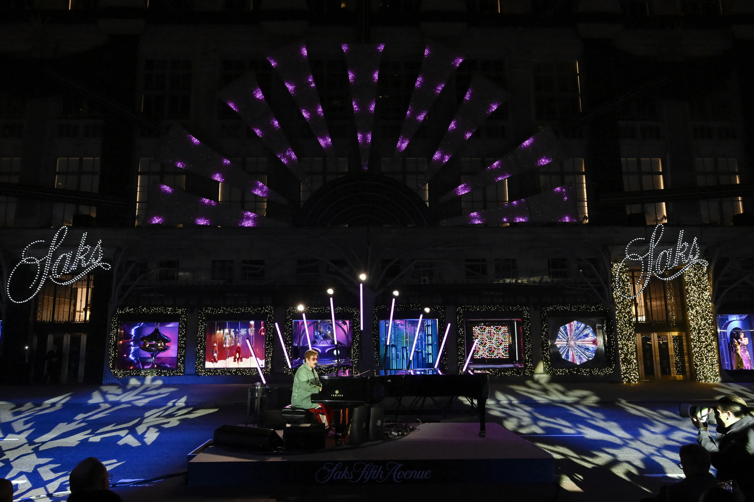 Elton John unveils the Saks Fifth Avenue's holiday windows and light show in association with The Elton John AIDS Foundation's Rocket Fund on Tuesday, November 22, 2022, in New York. (Photo by Evan Agostini/Invision/AP Photo)