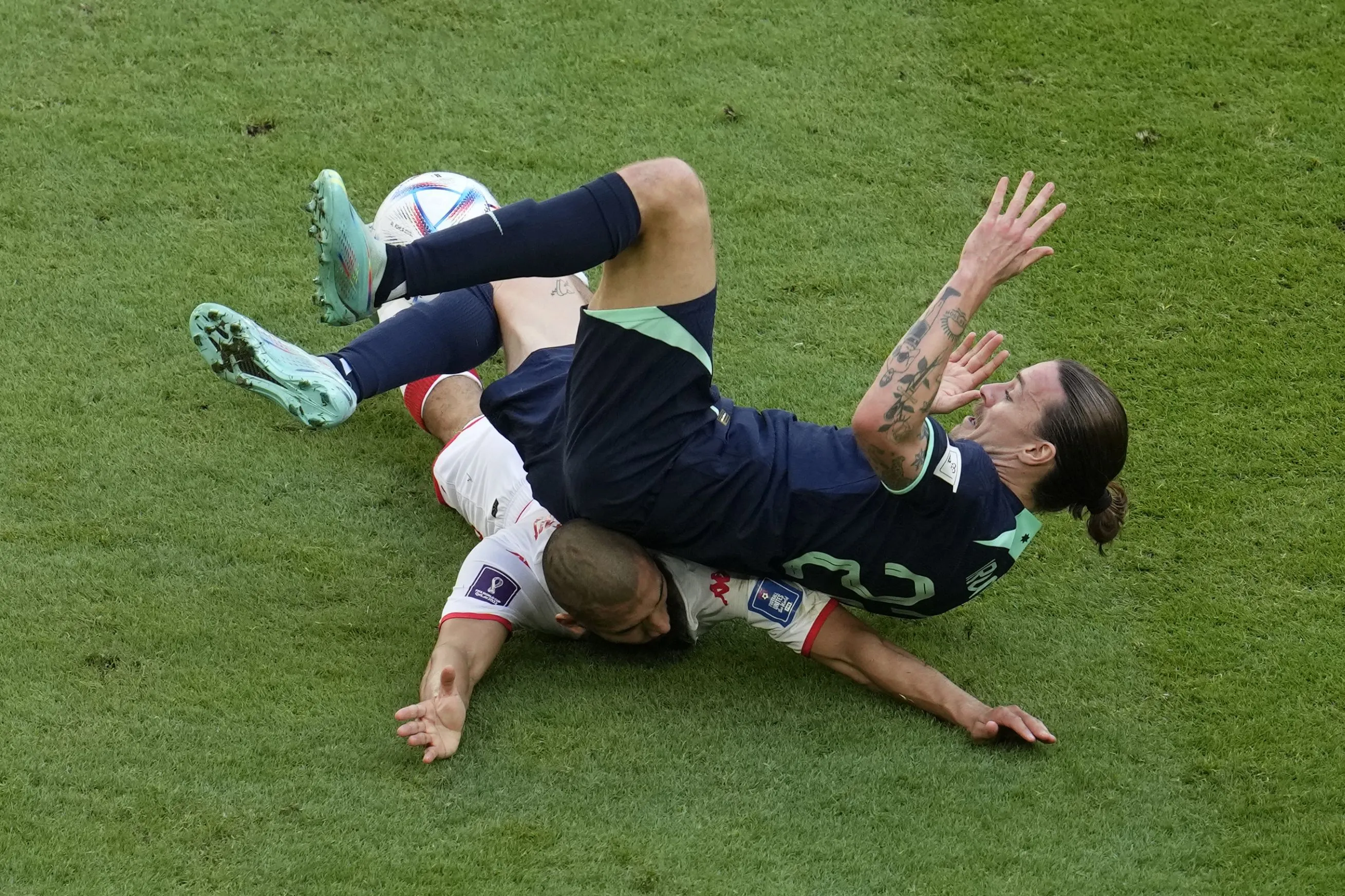Australia's Jackson Irvine falls on Tunisia's Aissa Laidouni during the World Cup group D soccer match between Tunisia and Australia at the Al Janoub Stadium in Al Wakrah, Qatar, Saturday, November 26, 2022. (Photo by Natacha Pisarenko/AP Photo)