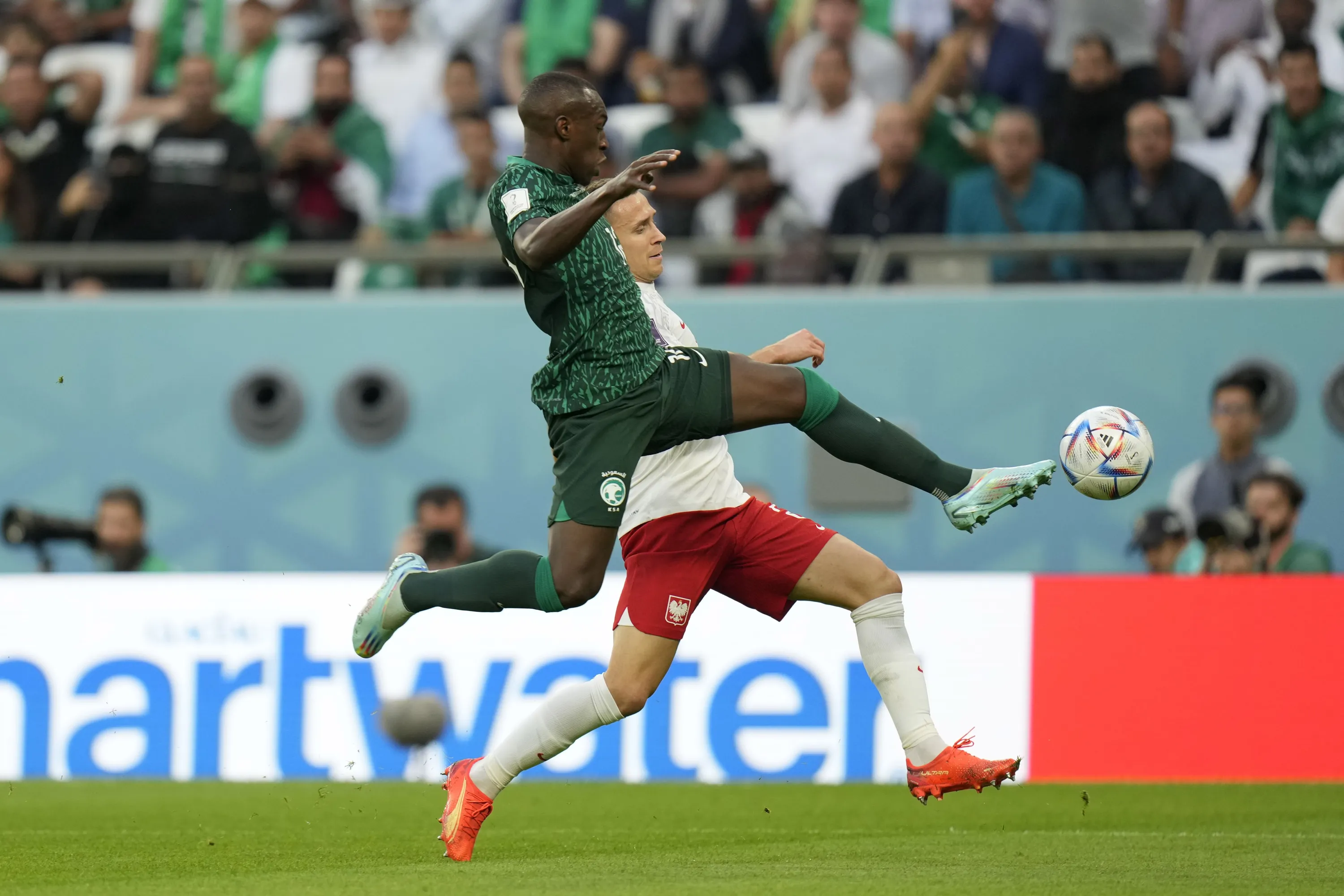 Saudi Arabia's Saud Abdulhamid, foreground, fights for the ball with Poland's Przemyslaw Frankowski during the World Cup group C soccer match between Poland and Saudi Arabia, at the Education City Stadium in Al Rayyan , Qatar, Saturday, November 26, 2022. (Photo by Francisco Seco/AP Photo)