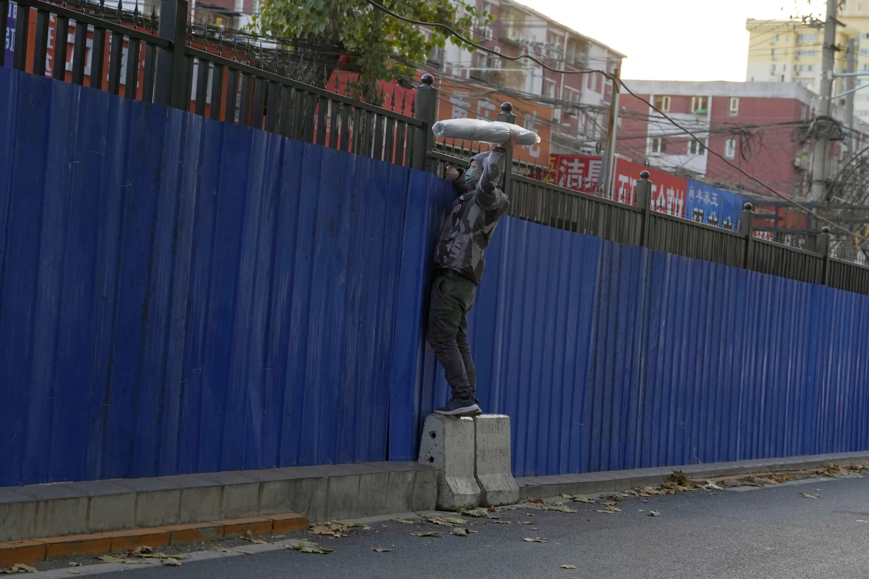 A man retrieves an item through the fences around a community under lockdown in Beijing, Saturday, November 26, 2022. (Photo by Ng Han Guan/AP Photo)