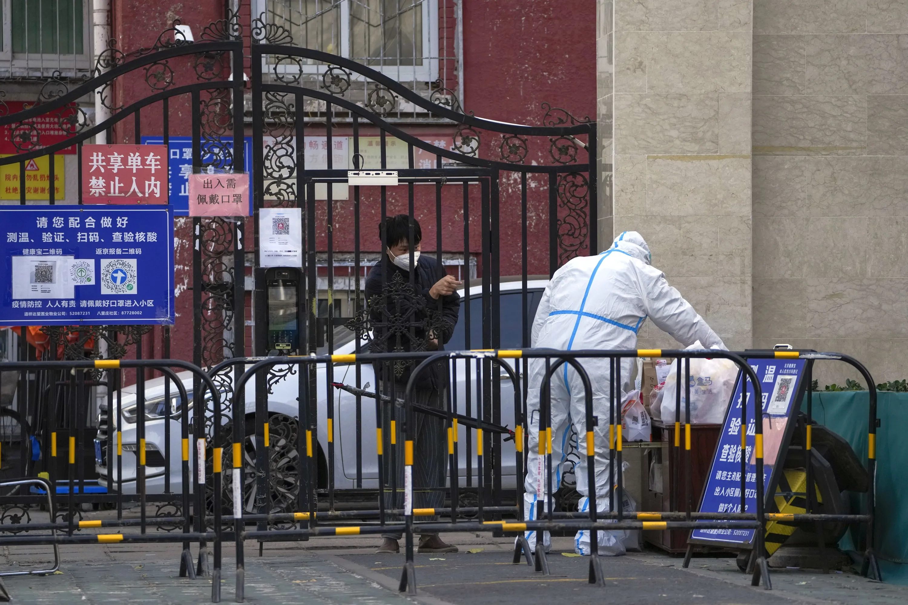 A man wearing a face mask asks a worker in protective suit to pick up his groceries at a lockdown neighborhood in Beijing, Sunday, November 27, 2022. Protests against China's strict zero-COVID policies in Shanghai continued on Saturday afternoon, after police cleared away hundreds of protesters in the early morning hours with force and pepper spray. (Photo by Andy Wong/AP Photo)
