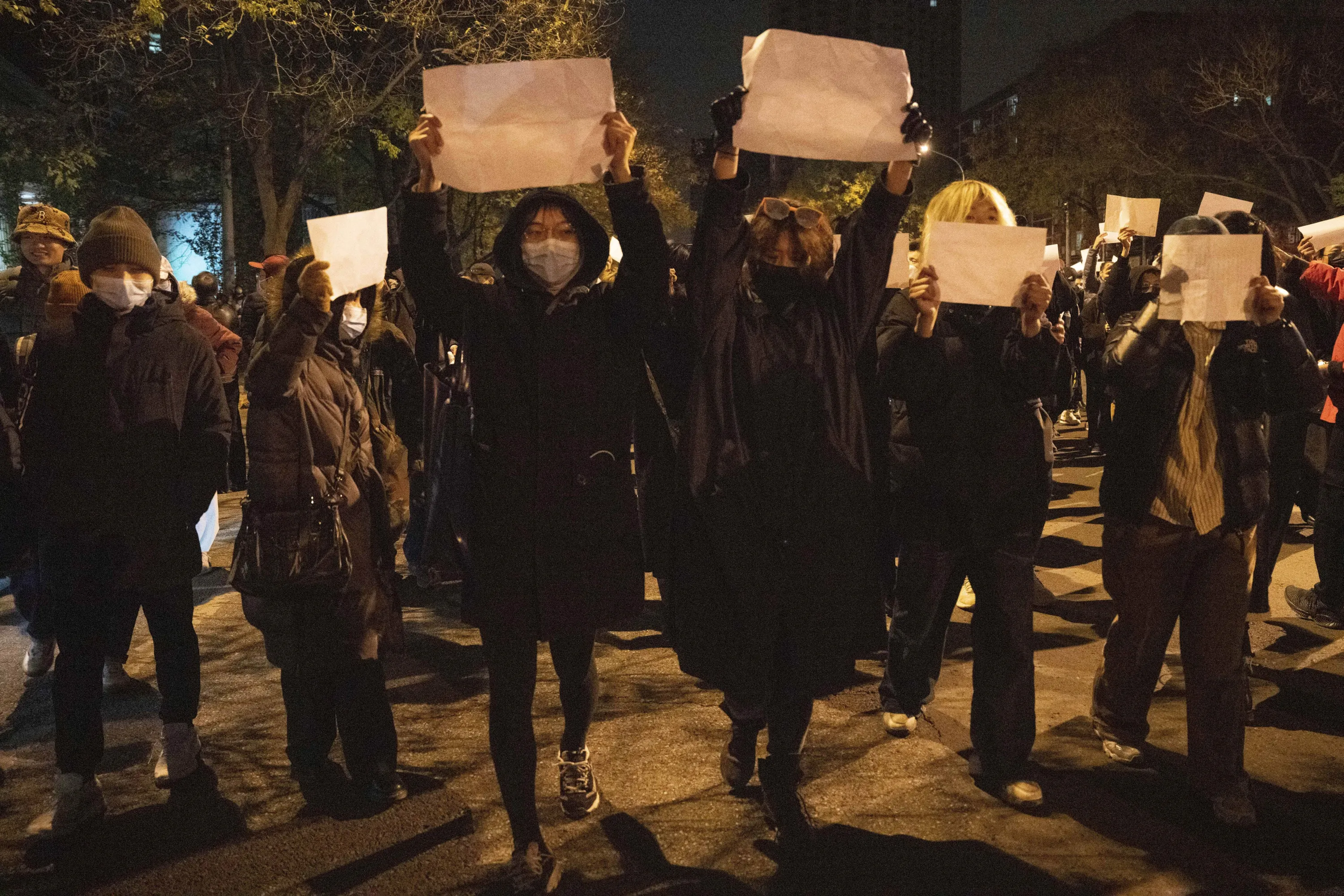 Protesters hold up blank papers and chant slogans as they march in protest in Beijing, Sunday, November 27, 2022. Protesters angered by strict anti-virus measures called for China's powerful leader to resign, an unprecedented rebuke as authorities in at least eight cities struggled to suppress demonstrations Sunday that represent a rare direct challenge to the ruling Communist Party. (Photo by Ng Han Guan/AP Photo)