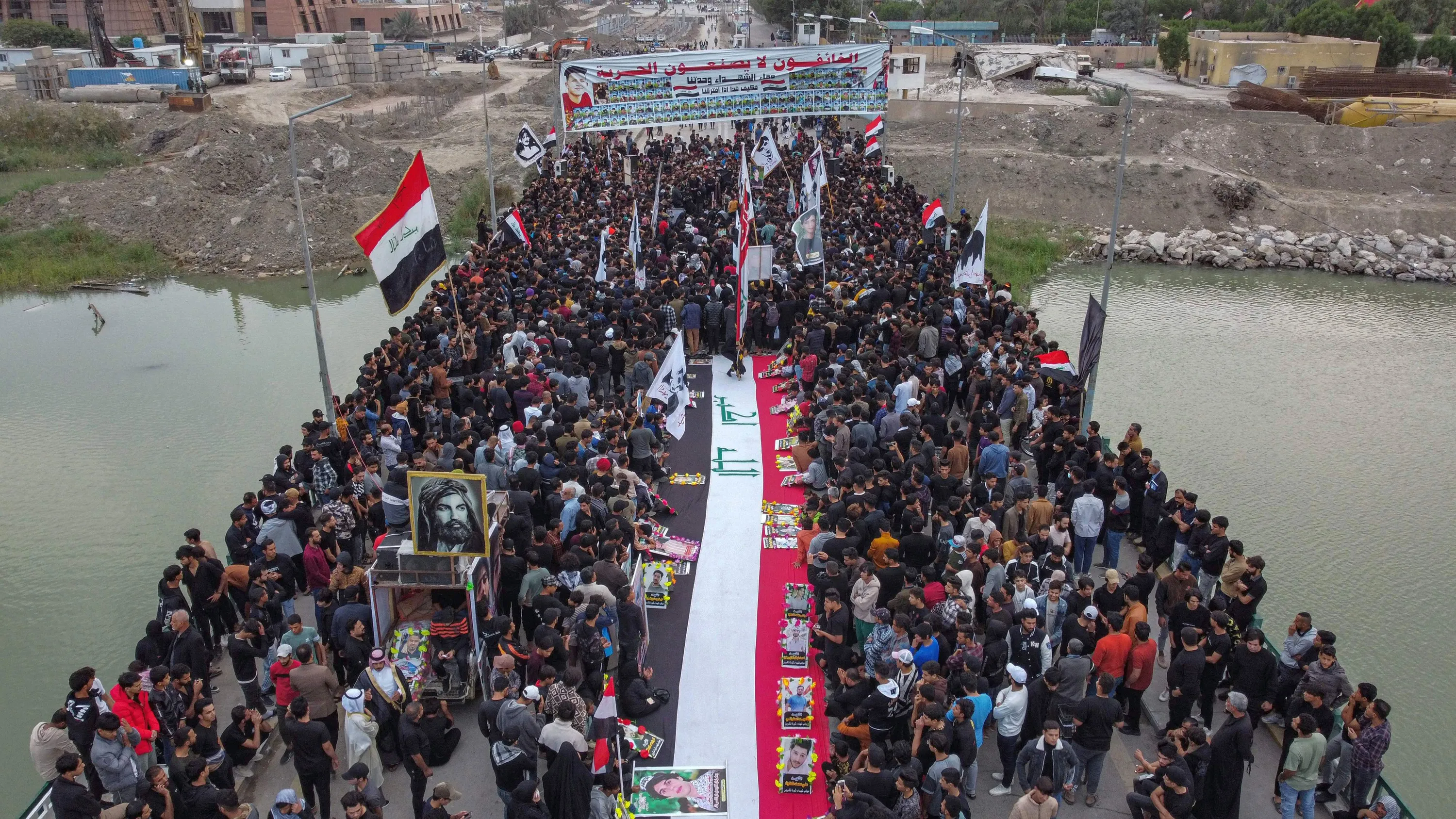 This aerial view shows locals in the city of Nasiriyah in Iraq's southern Dhi Qar province gathering along al-Zaitoon (Olive) bridge on November 28, 2022 to commemorate the third anniversary of the quelling of a protest and sit-in against deteriorating living conditions and lack of services at the same location by Iraqi security forces. (Photo by Asaad Niazi/AFP Photo)