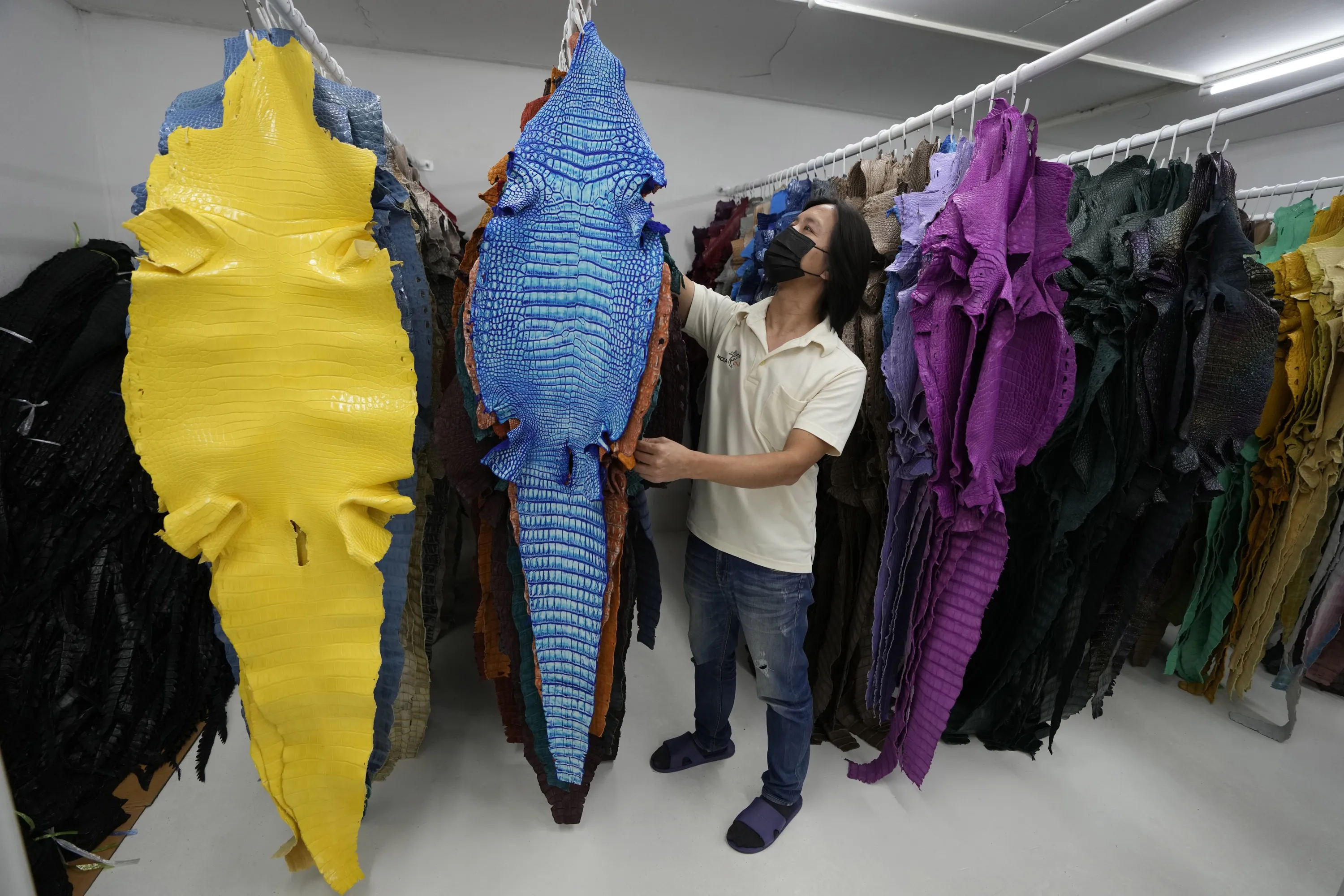 A worker checks treated dried skins of Siamese crocodiles at Siracha Moda Farm in Chonburi province, eastern Thailand on November 7, 2022. (Photo by Sakchai Lalit/AP Photo)