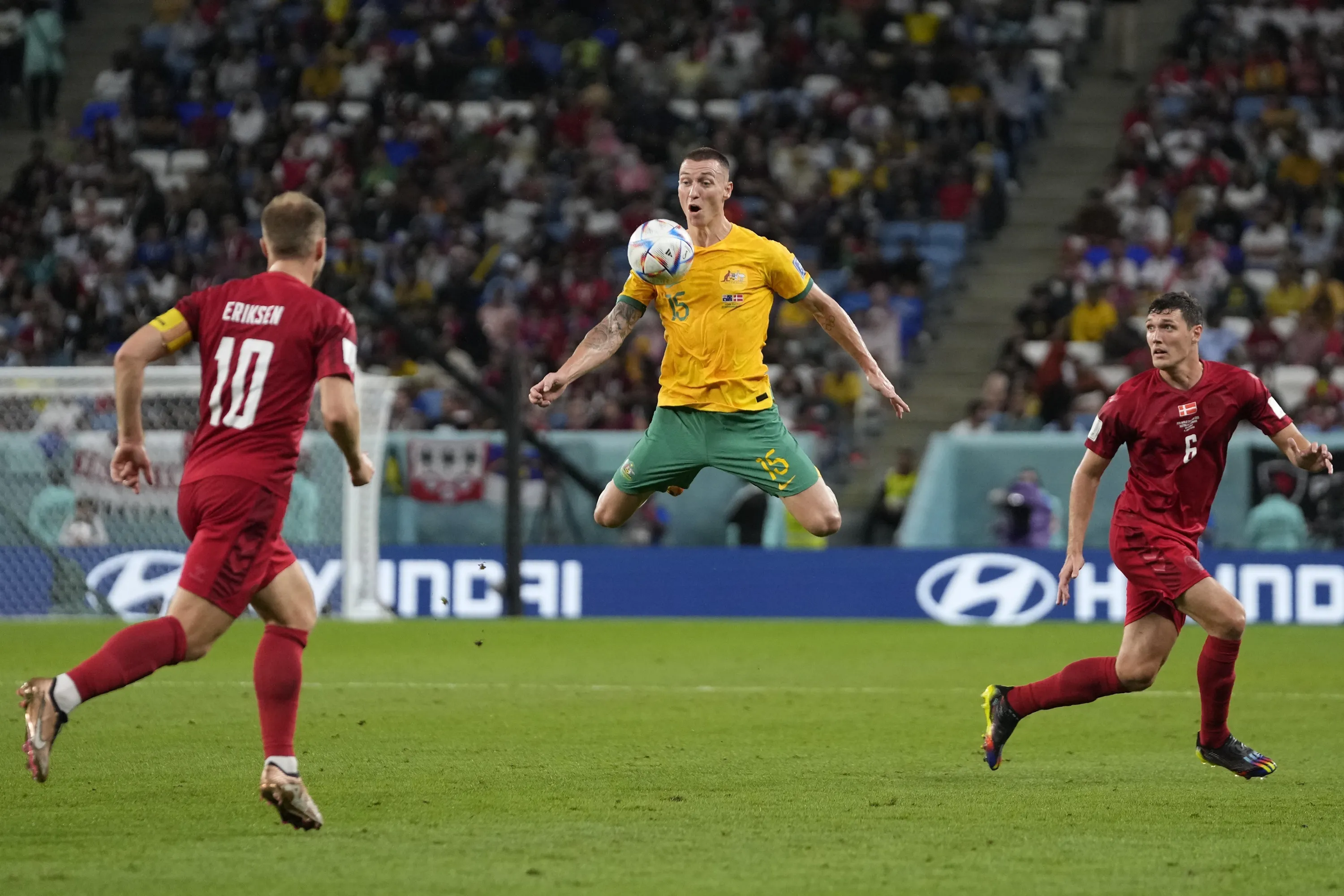 Australia's Mitchell Duke controls the ball during the World Cup group D soccer match between Australia and Denmark, at the Al Janoub Stadium in Al Wakrah, Qatar, Wednesday, November 30, 2022. (Photo by Thanassis Stavrakis/AP Photo)