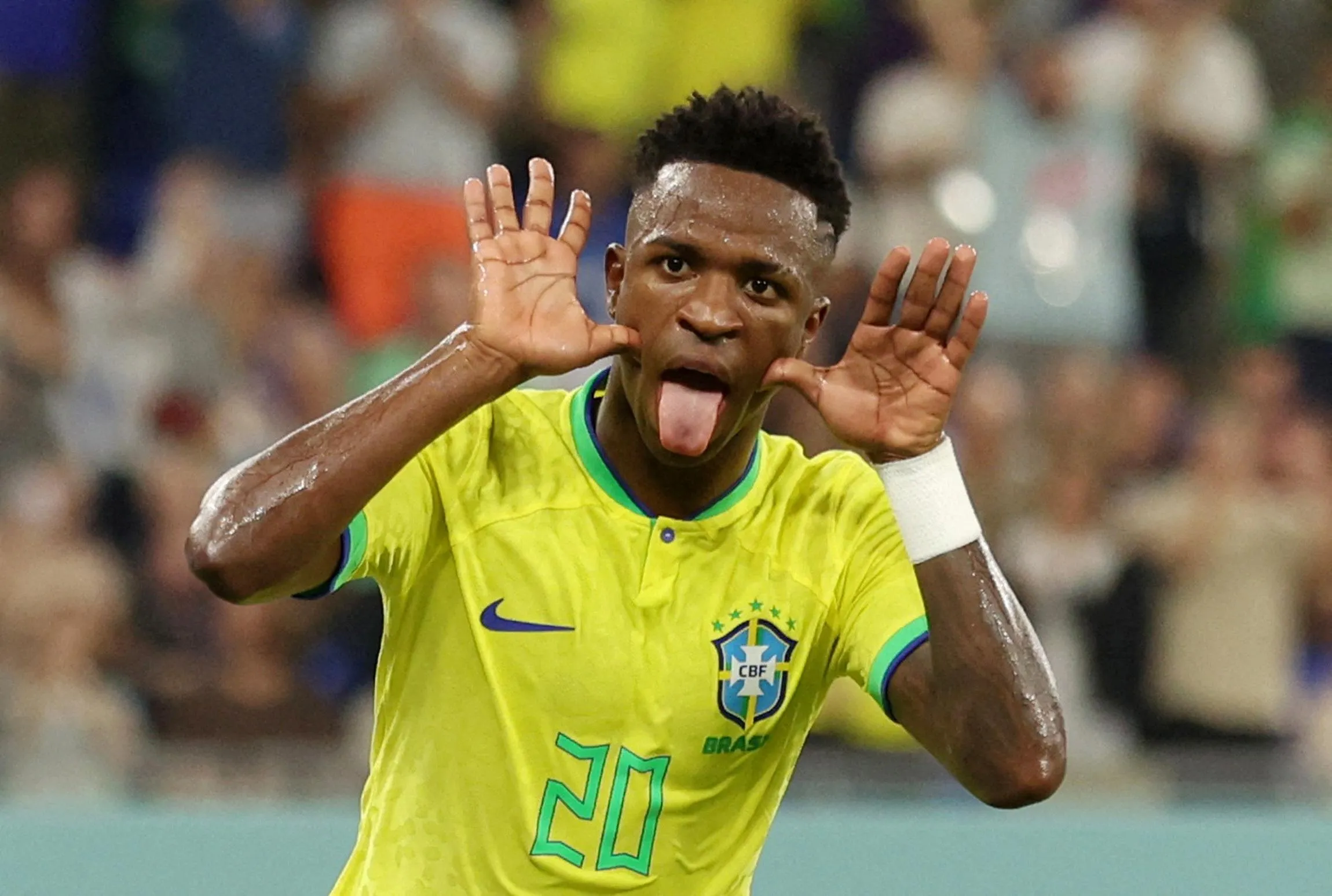 Vinicius Junior of Brazil celebrates after scoring a goal that was ruled offside during the FIFA World Cup Qatar 2022 Group G match between Brazil and Switzerland at Stadium 974 on November 28, 2022 in Doha, Qatar. (Photo by Carl Recine/Reuters)