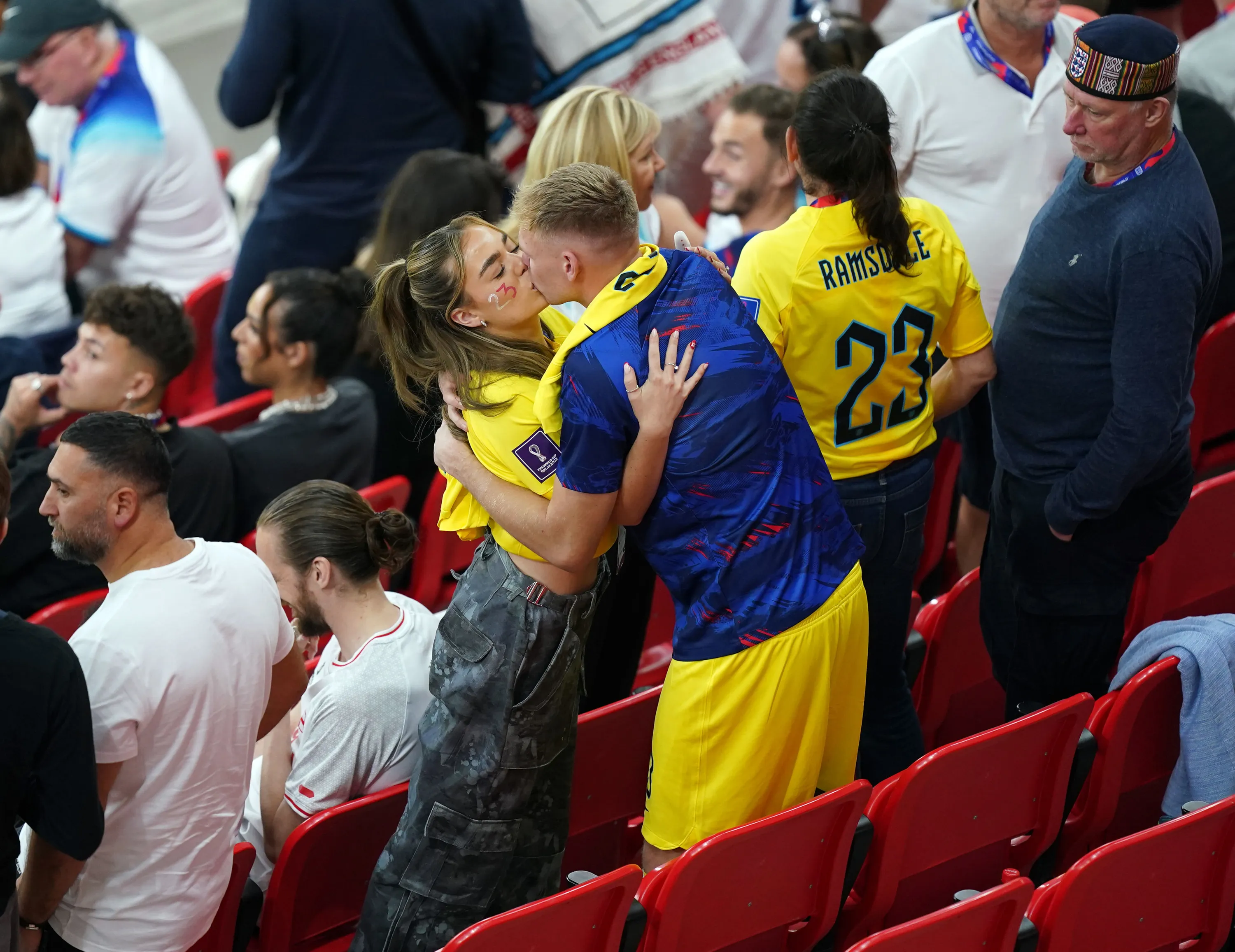 Flight attendant for British Airways Georgina Irwin (left) with fiance, England goalkeeper Aaron Ramsdale following the FIFA World Cup Group B match at the Ahmad Bin Ali Stadium, Al Rayyan, Qatar on Tuesday, November 29, 2022. (Photo by Mike Egerton/PA Wire Press Association)