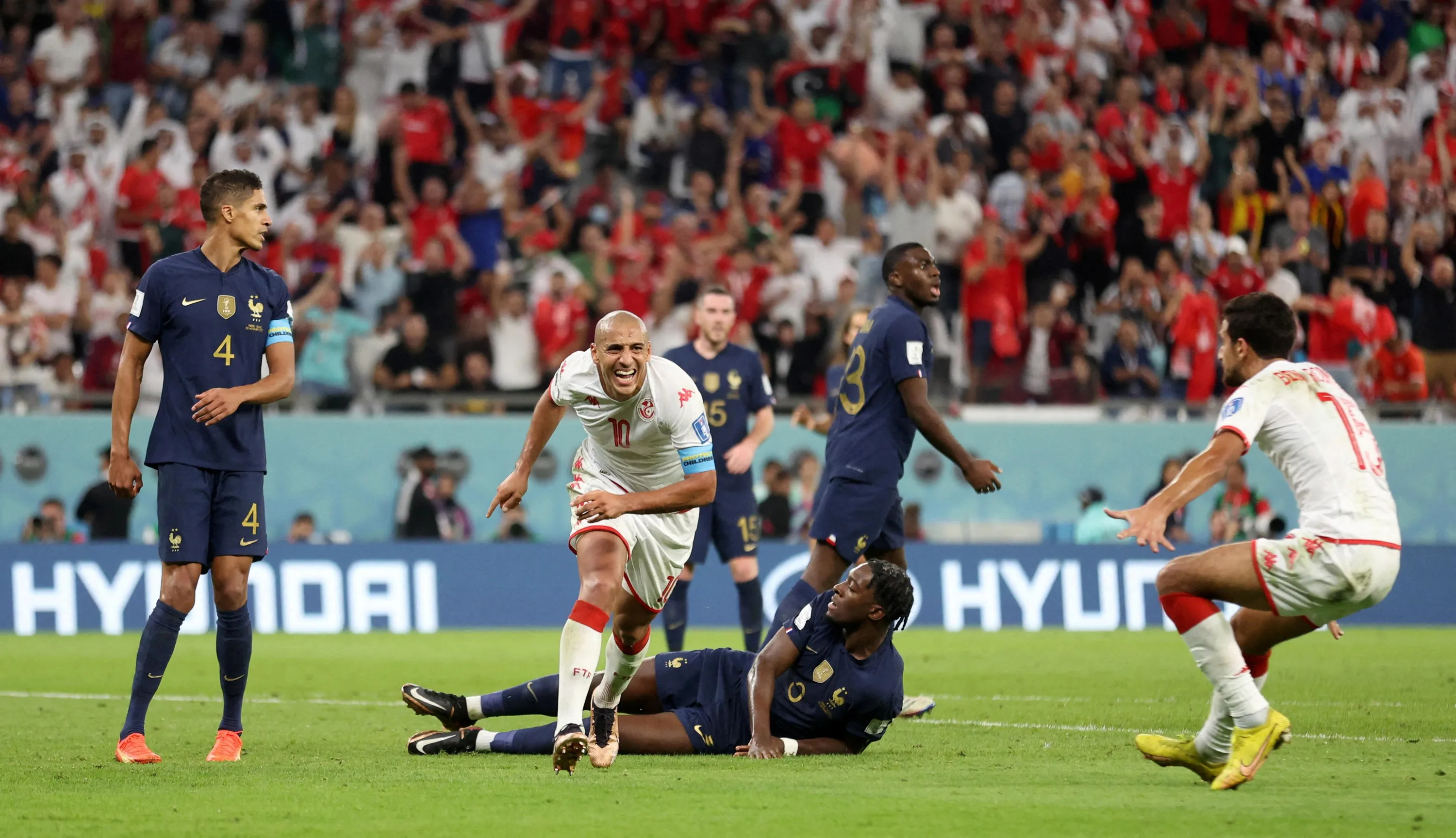 Wahbi Khazri of Tunisia celebrates after scoring their team's first goal during the FIFA World Cup Qatar 2022 Group D match between Tunisia and France at Education City Stadium on November 30, 2022 in Al Rayyan, Qatar. (Photo by Carl Recine/Reuters)