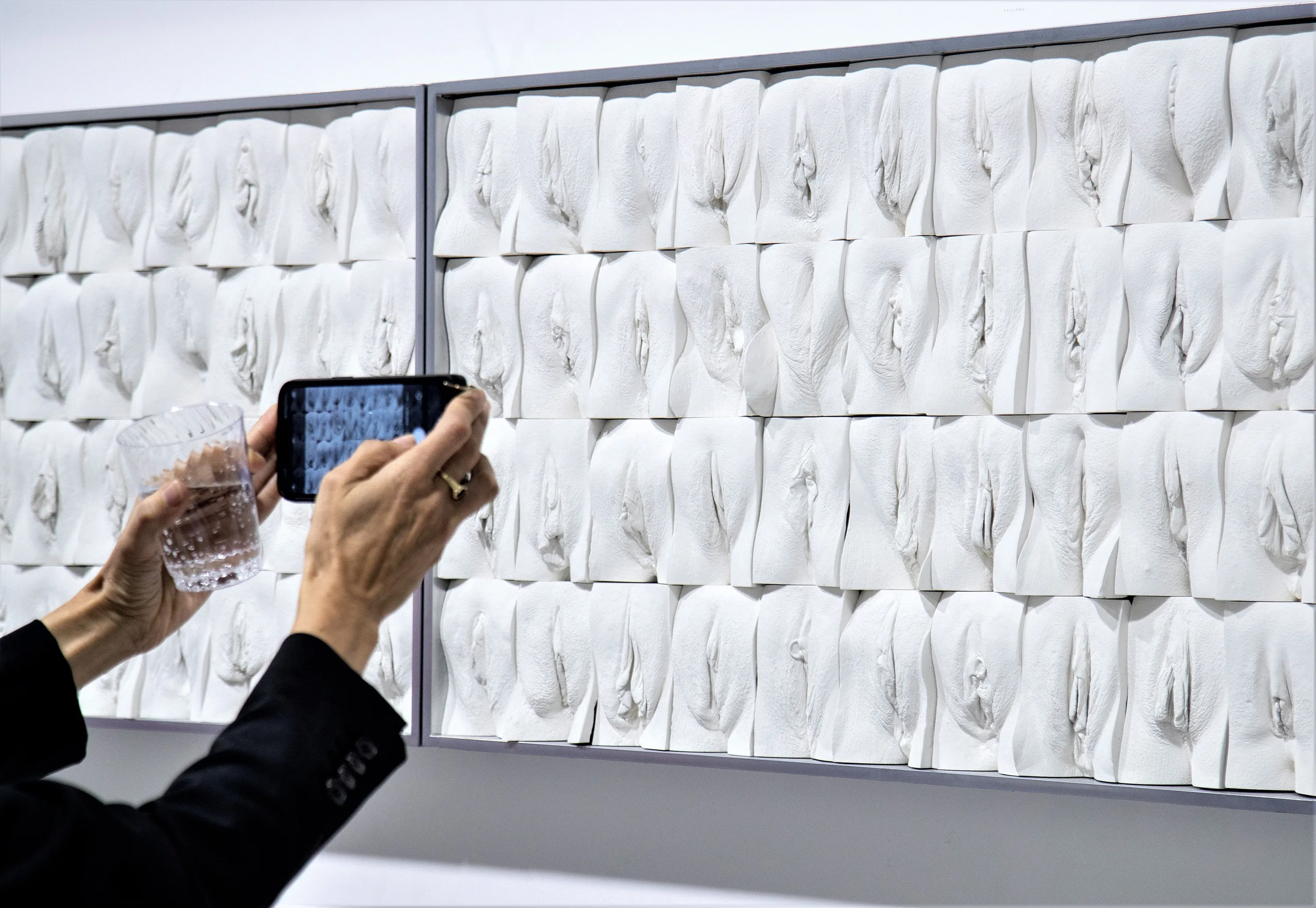 People attend the opening of the 'The Great Wall Vulva' mural exhibition by the British artist Jamie McCartney, at the Wilzig Erotic Art Museum of Miami, in Miami Beach, Florida, USA, 28 November 2022. Five years in the making and completed in 2011 the mural, according to the organizers, features vulva casts of 400 women who volunteered to participate in an overwhelming endorsement of McCartney’s idea to demonstrate, via sheer scale, the vastness of vulva diversity and ease genital anxiety while providing an intimate and emotional visual spectacle. (Photo by Cristóbal Herrera/EPA/EFE)