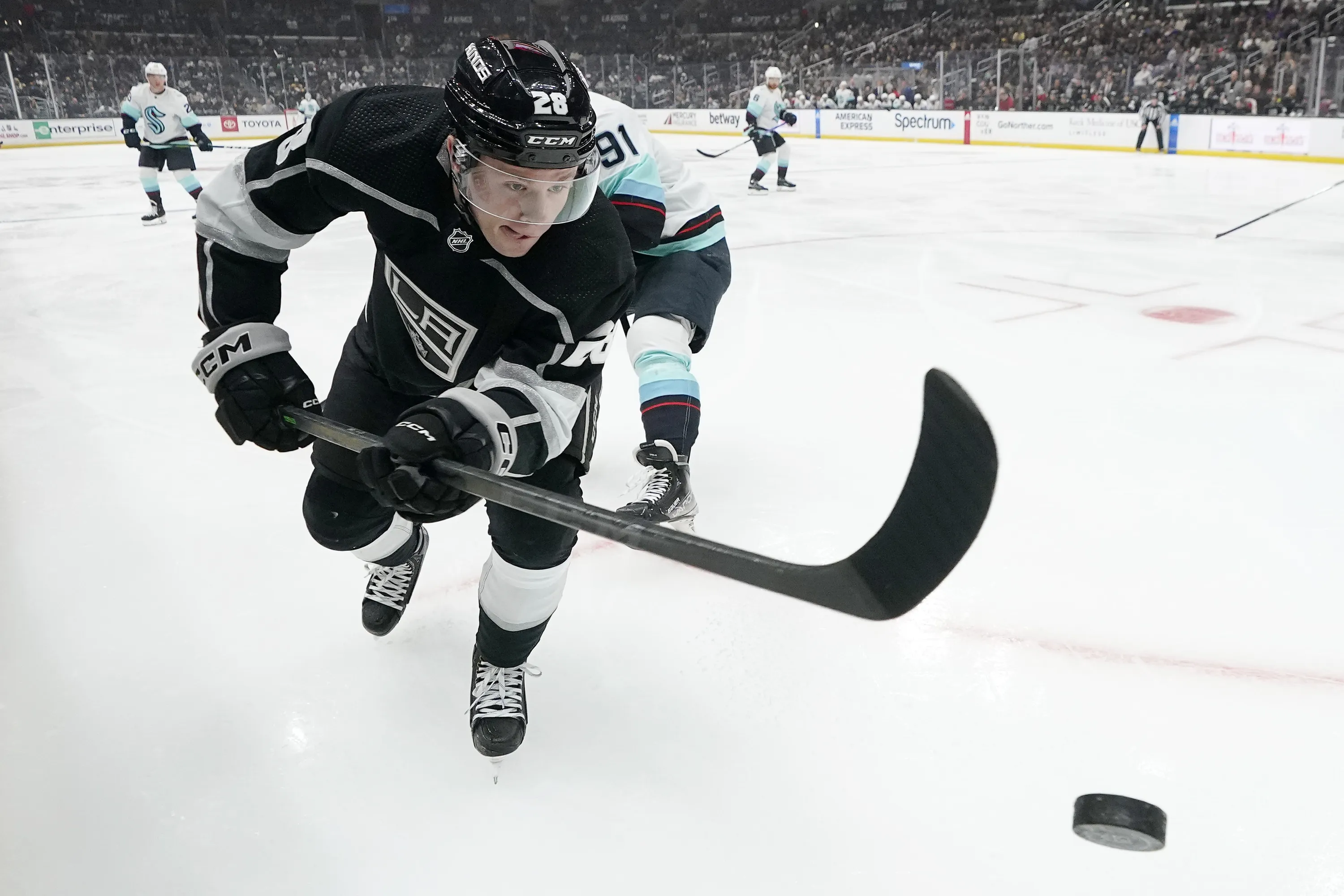 Los Angeles Kings center Jaret Anderson-Dolan, left, chases the puck while under pressure from Seattle Kraken right wing Daniel Sprong during the third period of an NHL hockey game Tuesday, November 29, 2022, in Los Angeles. (Photo by Mark J. Terrill/AP Photo)