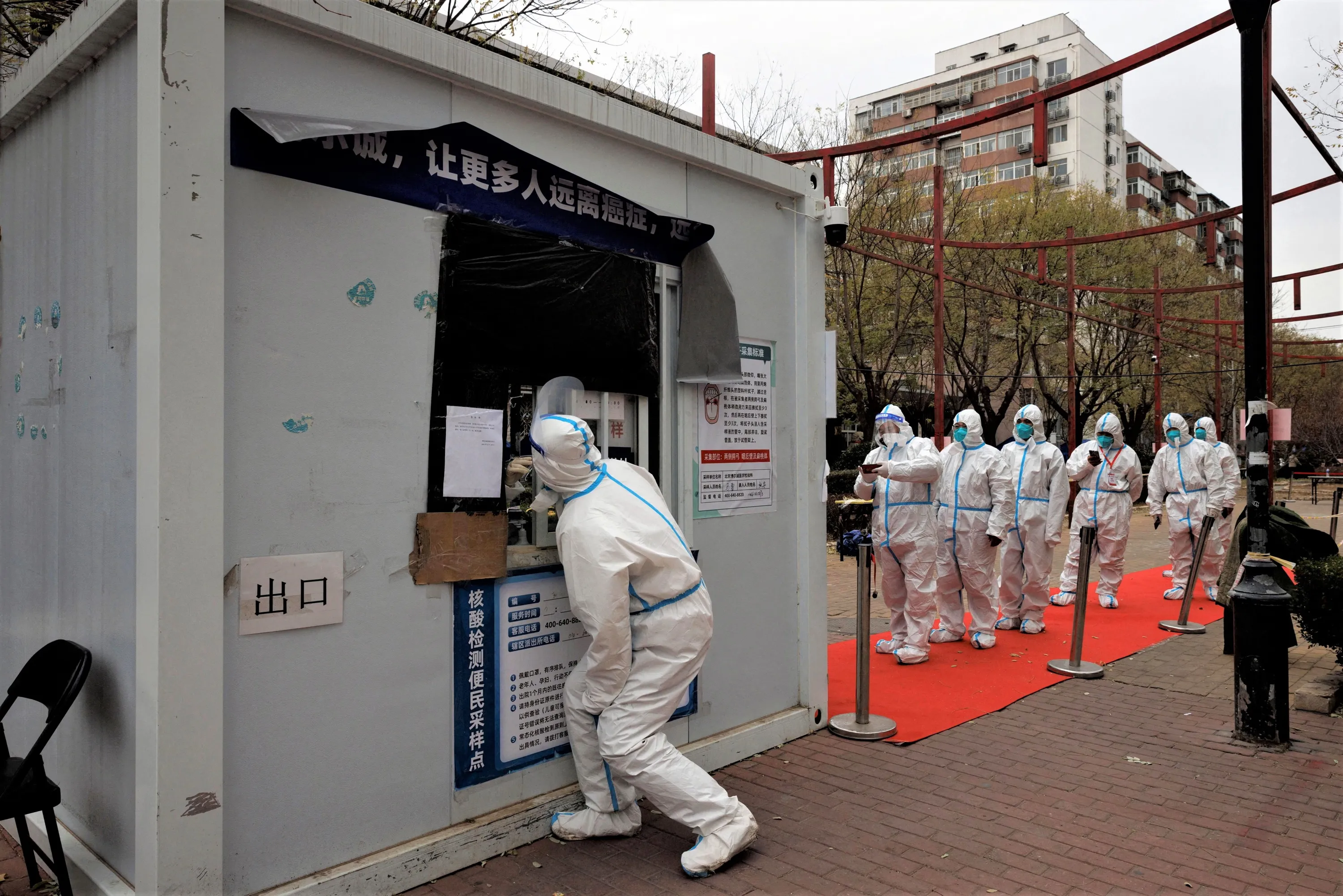 Epidemic-prevention workers in protective suits line up to get swab tested as outbreaks of coronavirus disease (COVID-19) continue in Beijing, China on November 28, 2022. (Photo by Thomas Peter/Reuters)