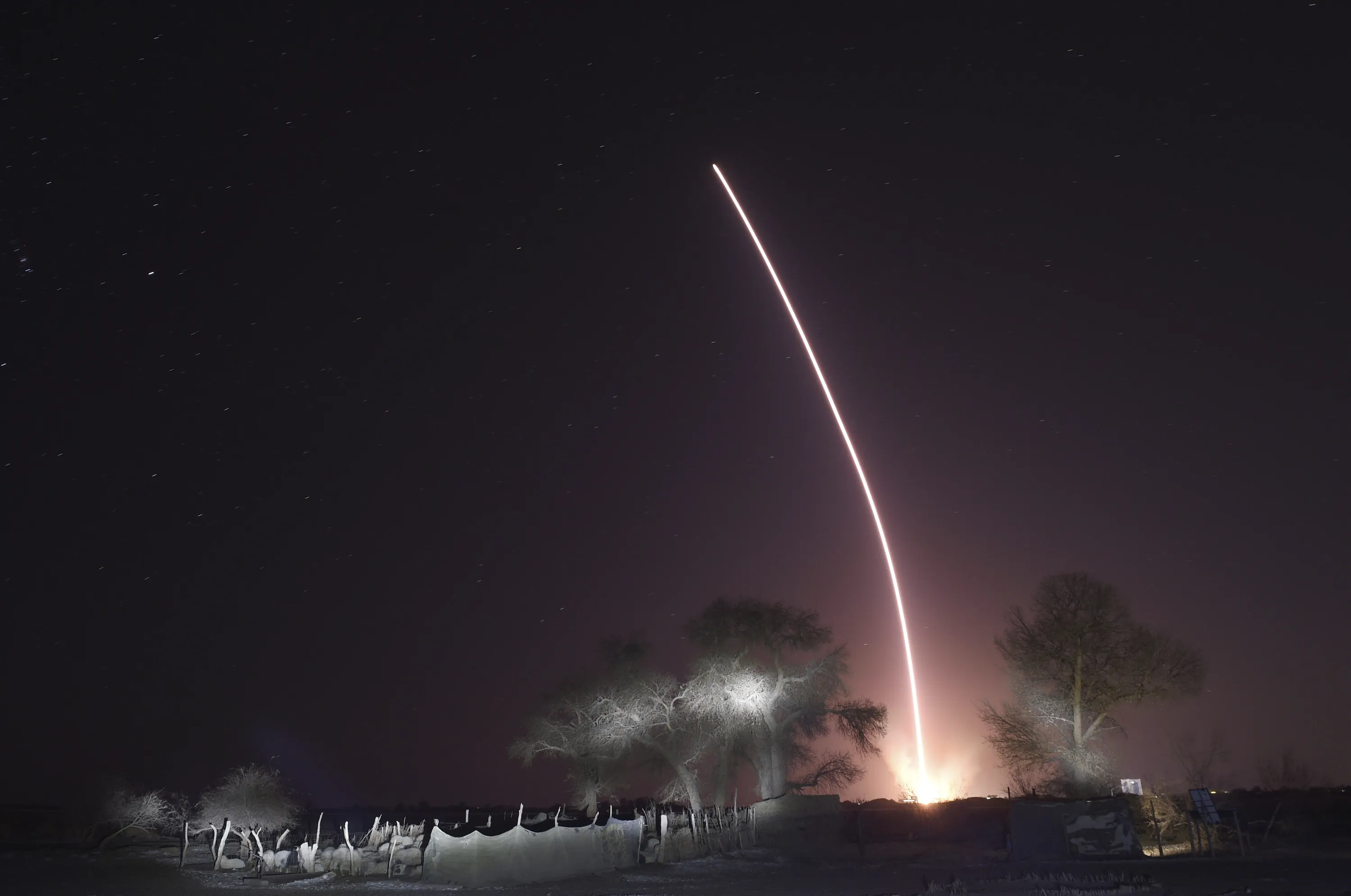 In this photo released by Xinhua News Agency, the light trail of the launched manned spaceship Shenzhou-15, atop the Long March-2F Y15 carrier rocket after it blasted off from the Jiuquan Satellite Launch Center in northwestern China on Tuesday, November 29, 2022. China launched the rocket Tuesday carrying three astronauts to complete construction of the country's permanent orbiting space station. (Photo by Ren Junchuan/Xinhua via AP Photo)