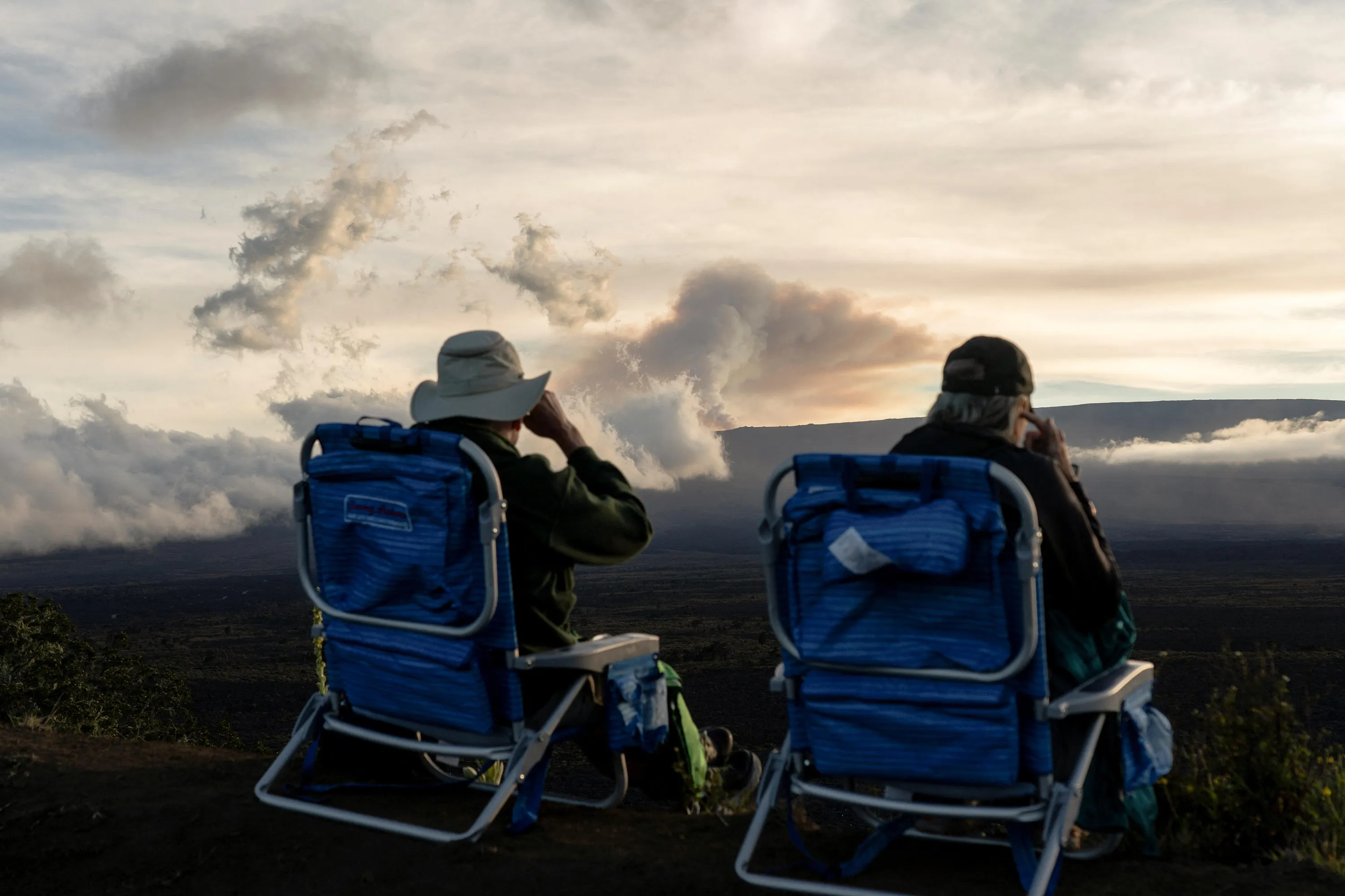 People sit in chairs while observing the eruption of the Mauna Loa Volcano in Hawaii, U.S. December 1, 2022. (Photo by Go Nakamura/Reuters)