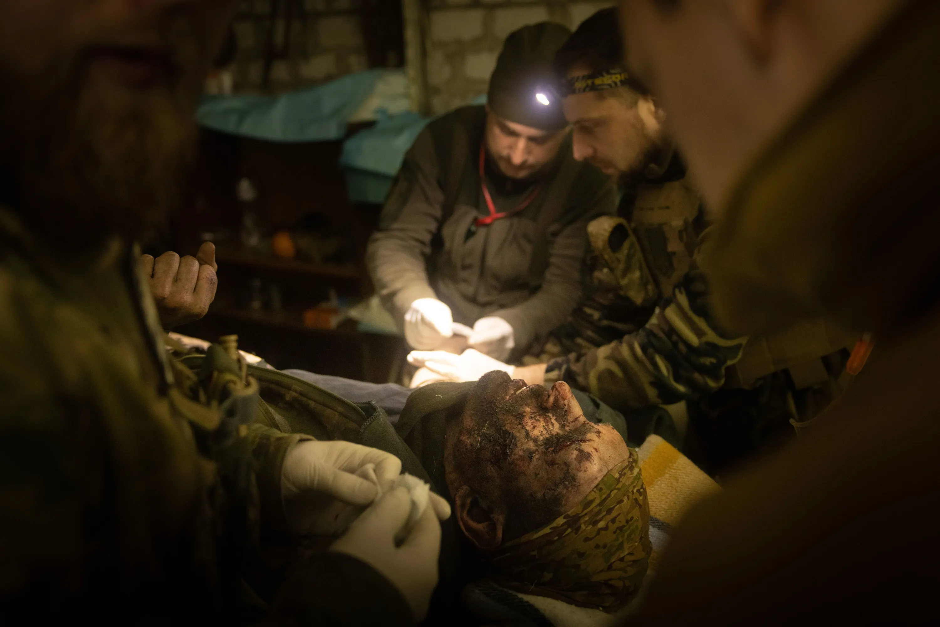 Military medics work on a member of the Ukrainian military suffering from head and leg injuries caused by a mine, in a frontline field hospital on December 04, 2022 outside Bakhmut, Ukraine. Russia continues its campaign to seize Bakhmut, Donetsk region, in what many analysts regard as an offensive with more symbolic value than operational importance for Russia. In a recent intelligence report, the British ministry of defense said Russia would try to encircle the city. (Photo by Chris McGrath/Getty Images)