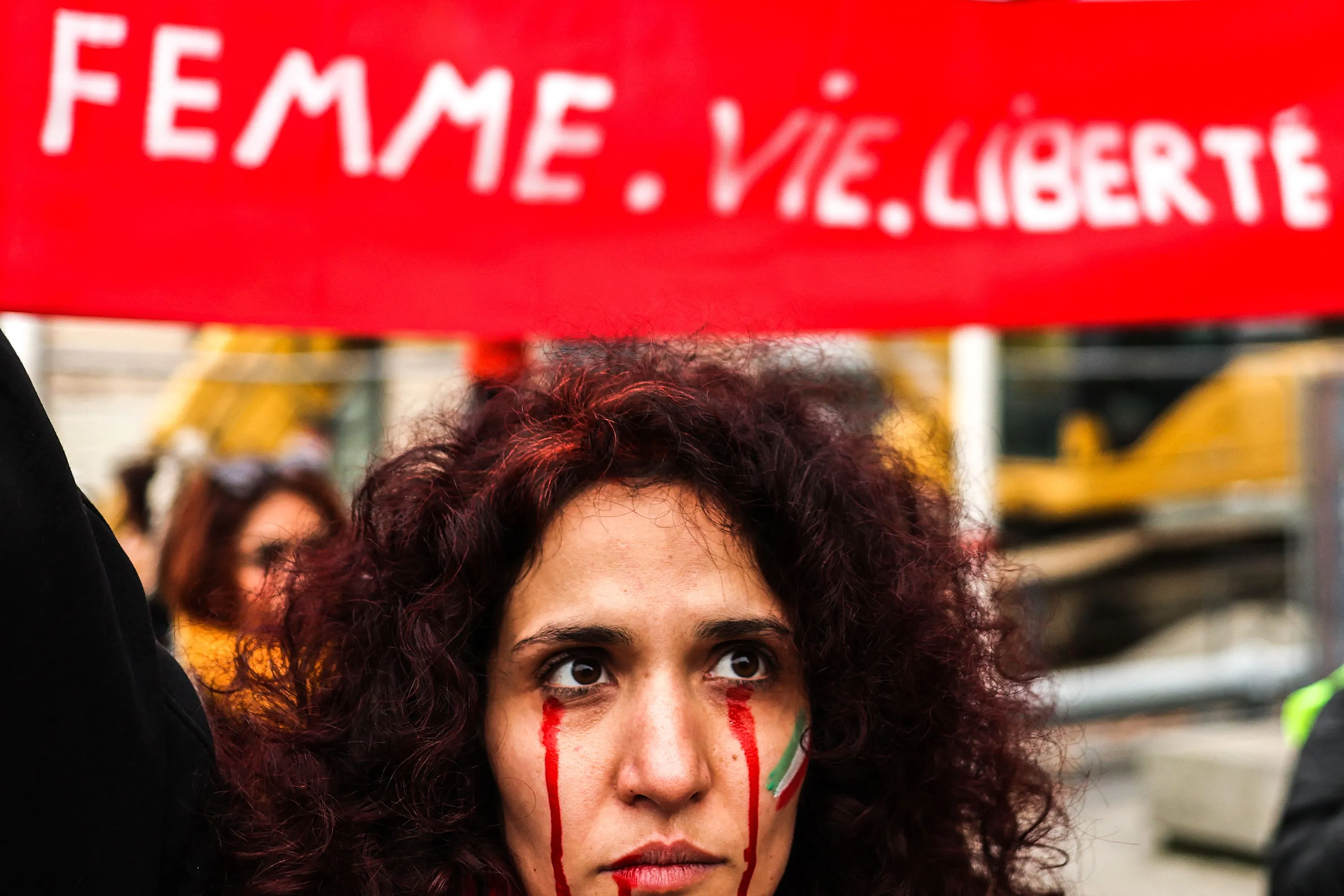 A protestor with red tears painted on her face during a rally in support of the demonstrations in Iran, in Toulouse, south-western France, on December 3, 2022. (Photo by Charly Triballeau/AFP Photo)
