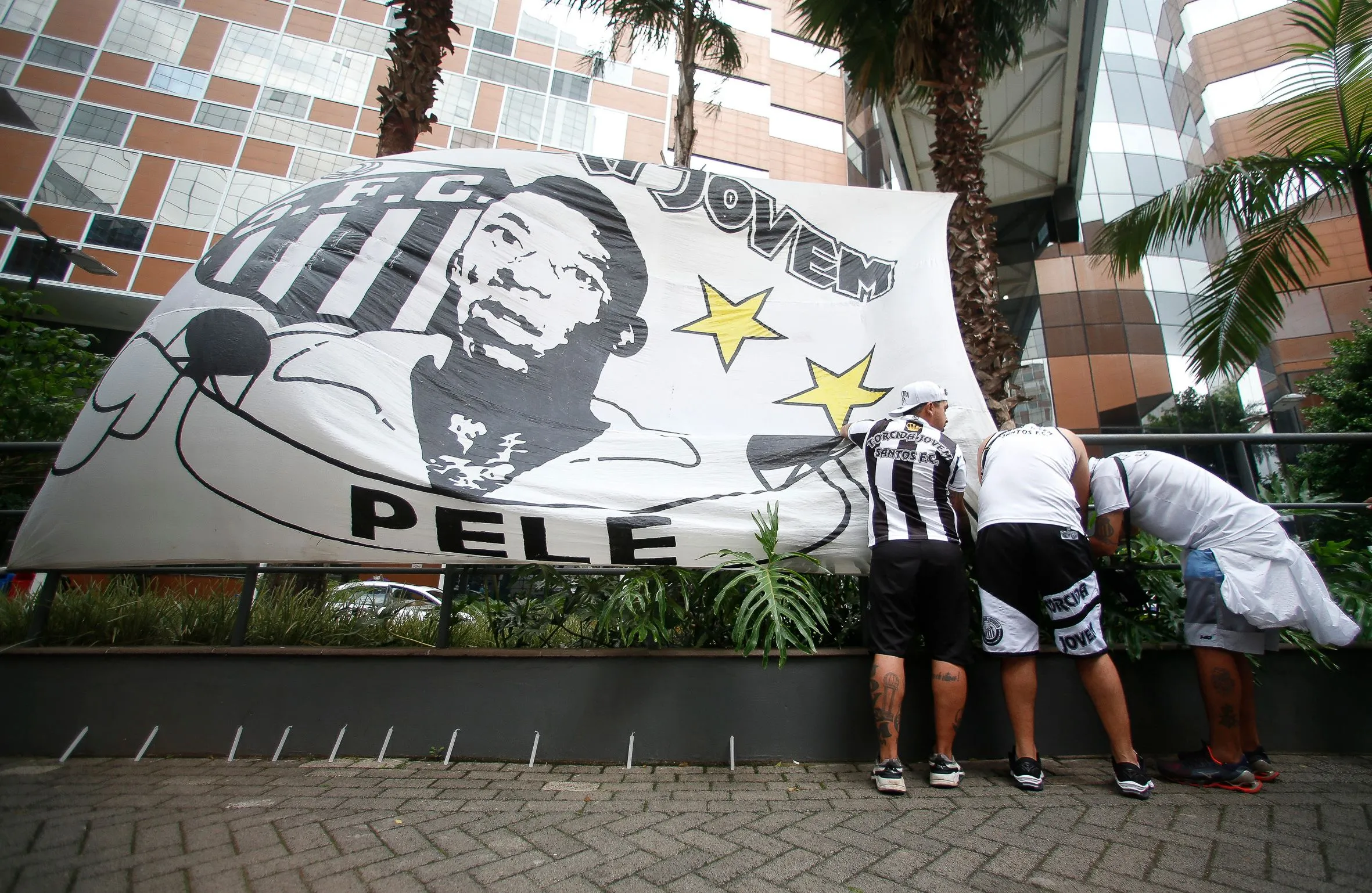 Fans of Santos place a flag with the image of Brazilian football legend Pele during a vigil outside the Albert Einstein Israelite Hospital entrance, where he is hospitalized in Sao Paulo, Brazil, on December 4, 2022. Brazilian football legend Pele said on Saturday that he feels “strong, with a lot of hope” despite medical problems that have kept the 82-year-old sports icon in the hospital with a respiratory infection. (Photo by Miguel Schincariol/AFP Photo)