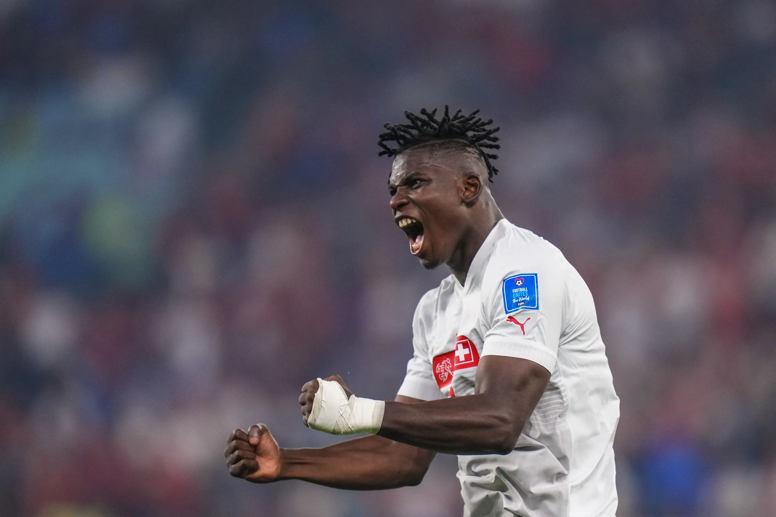 Switzerland's Breel Embolo celebrates after his teammate Switzerland's Remo Freuler scored his side's third goal during the World Cup group G soccer match between Serbia and Switzerland, at the Stadium 974 in Doha, Qatar, Friday, December 2, 2022. (Photo by Petr David Josek/AP Photo)