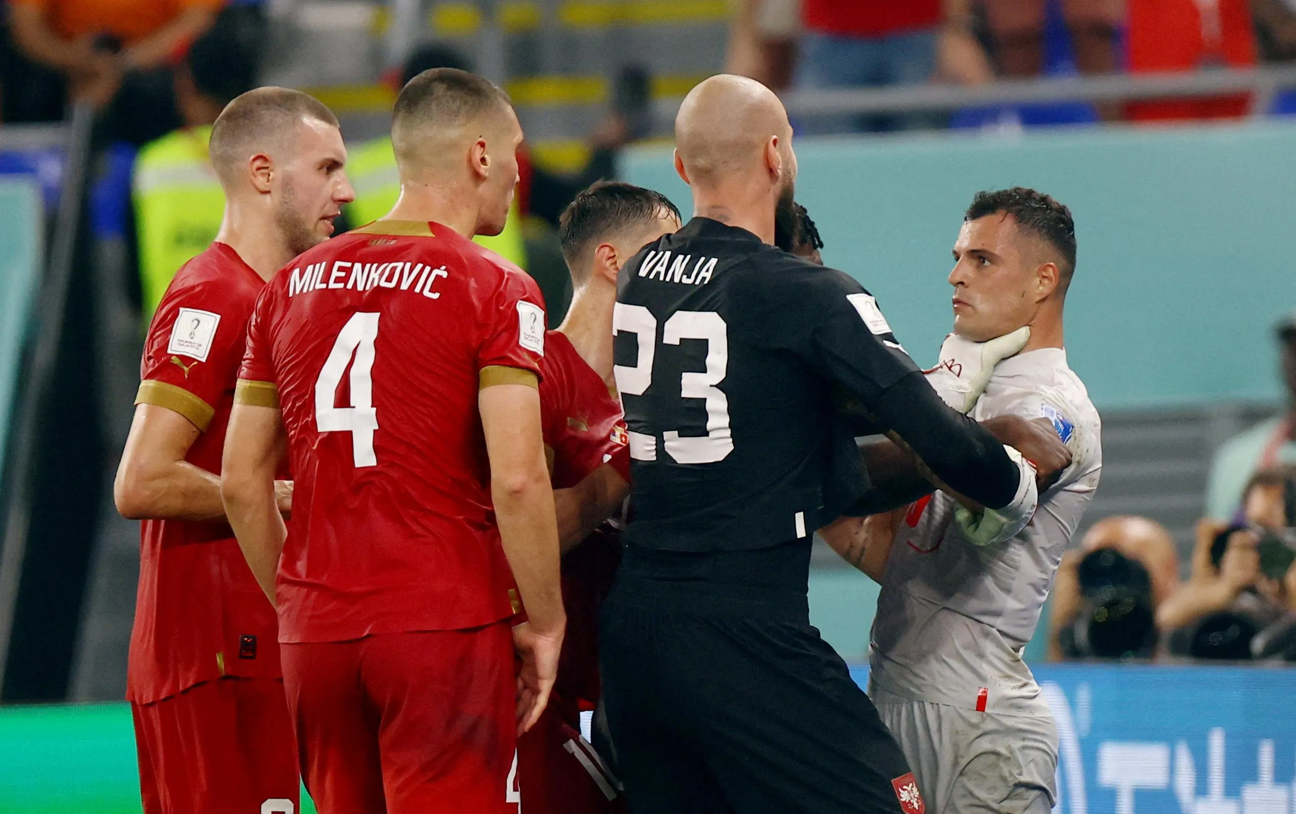 Granit Xhaka (10) of Switzerland argues with Serbian players during the FIFA World Cup Qatar 2022 Group G match between Serbia and Switzerland at Stadium 974 in Doha, Qatar on December 02, 2022. (Photo by Hannah Mckay/Reuters)