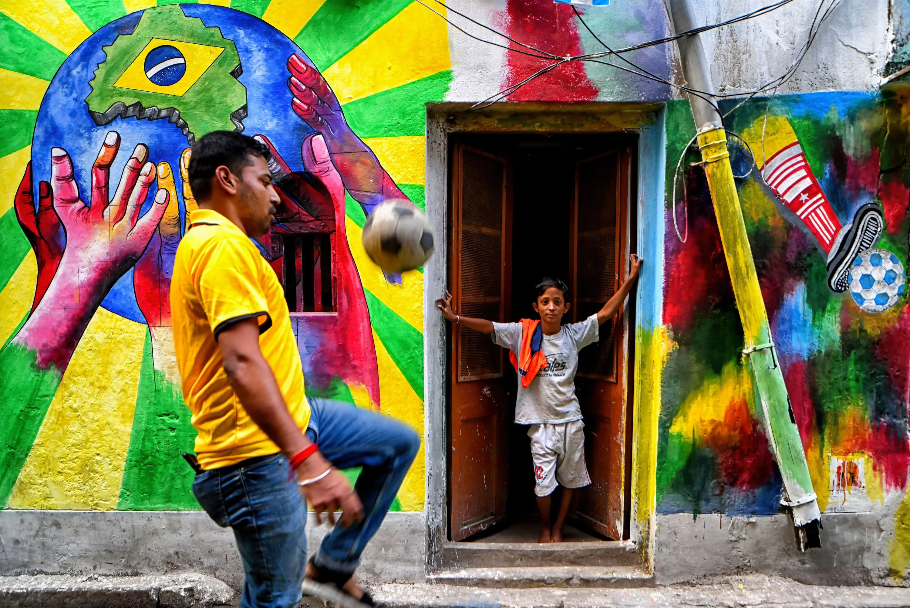 A member of the Dishari club seen playing football in front of street art during the celebration of the FIFA World Cup 2022 in Kolkata on November 26, 2022. (Photo by Avishek Das/SOPA Images/Rex Features/Shutterstock)