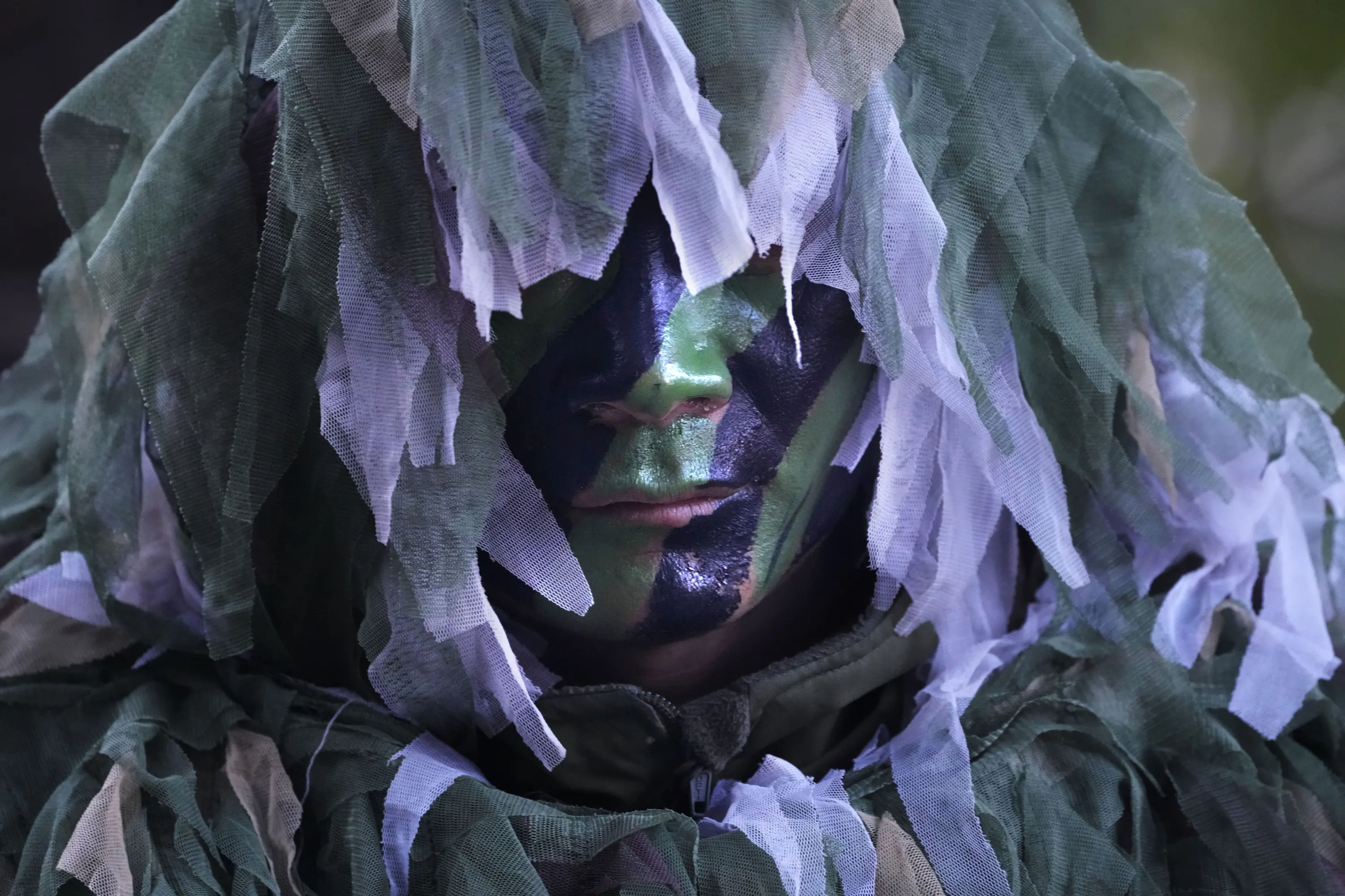 An Indian army sniper takes position during Jungle lane terrain drill at the Indo-US joint exercise or "Yudh Abhyas, in Auli, in the Indian state of Uttarakhand, Tuesday, November 29, 2022. (Photo by Manish Swarup/AP Photo)
