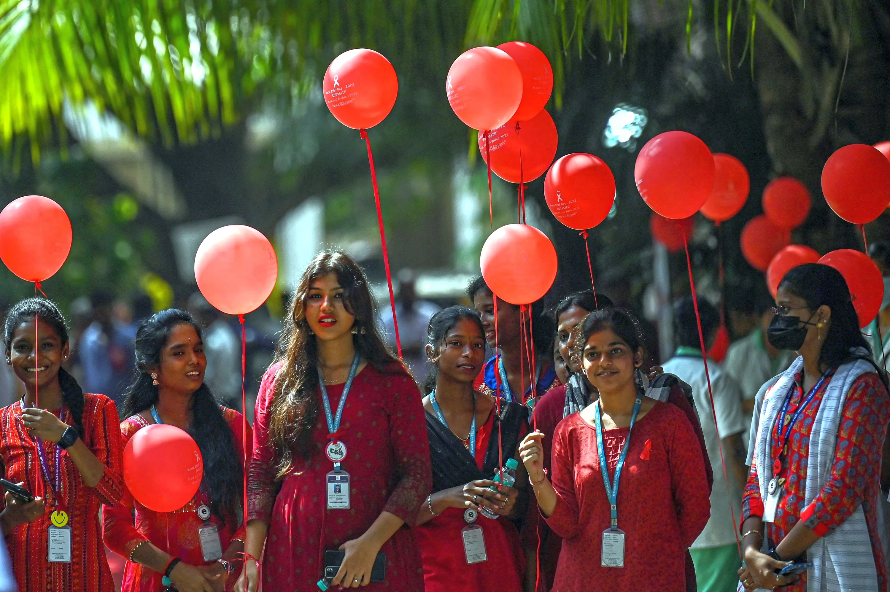 Students hold balloons as they take part in an awareness campaign on the occassion of 'World Aids Day' at Health and Family Welfare Training centre in Chennai on December 1, 2022. (Photo by Arun Sankar/AFP Photo)