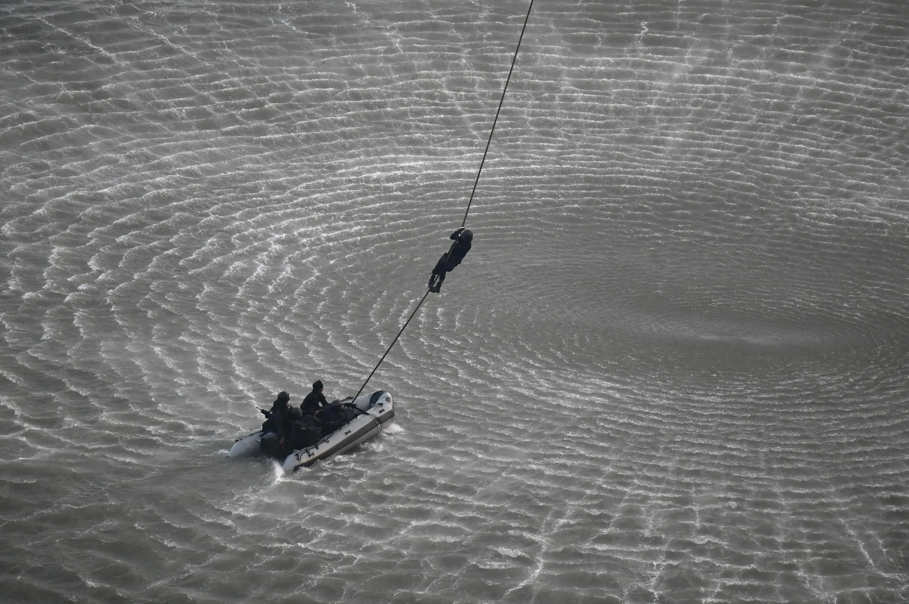 Marine Commandos of the Indian Navy get down with a rope during a simulated hostage rescue operation as part of the rehearsal of Navy Day celebrations at the Gateway of India in Mumbai on December 2, 2022. (Photo by Punit Paranjpe/AFP Photo)