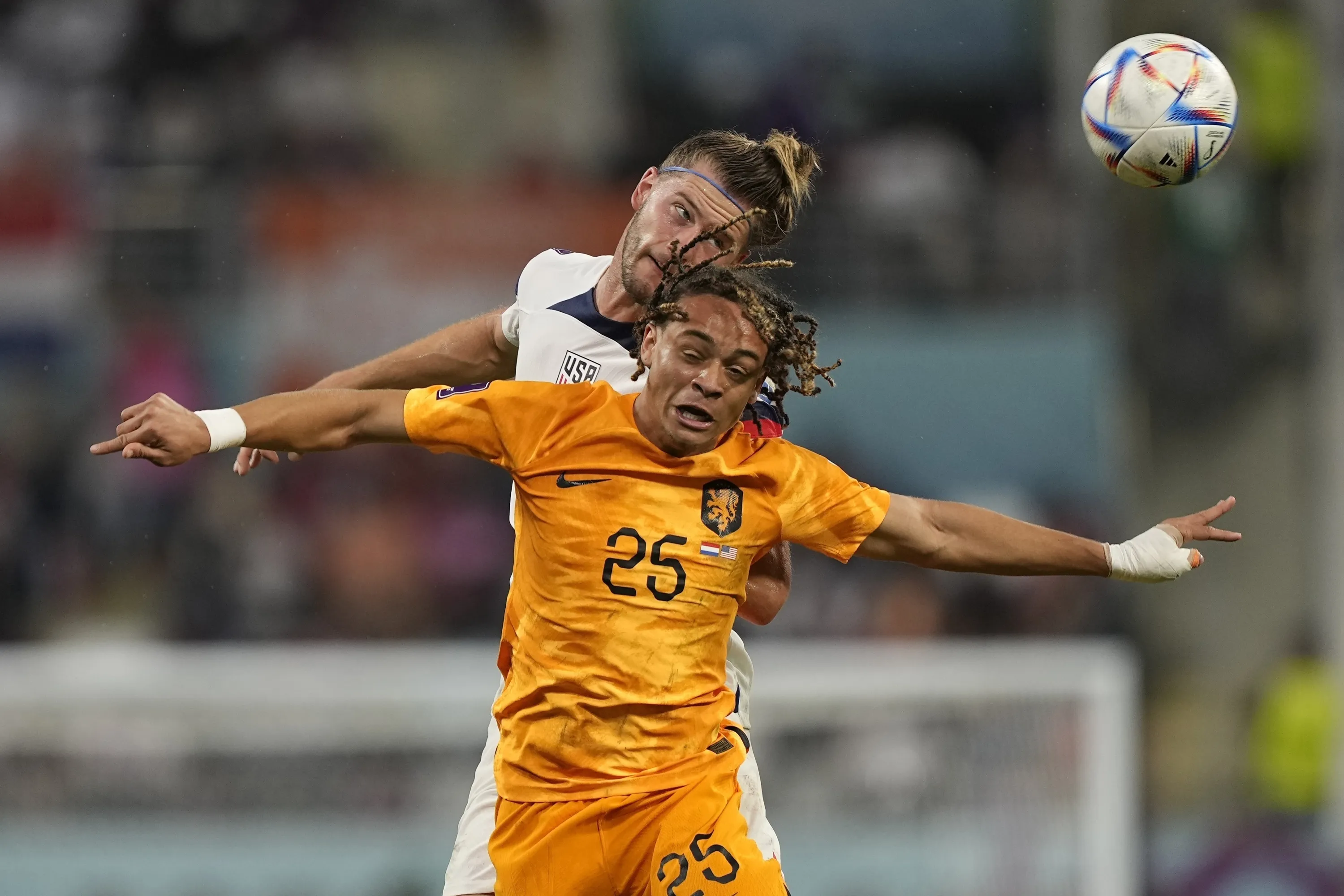 Walker Zimmerman of the United States, background, and Jeremie Frimpong of the Netherlands jump for the ball during the World Cup round of 16 soccer match between the Netherlands and the United States, at the Khalifa International Stadium in Doha, Qatar, Saturday, December 3, 2022. (Photo by Martin Meissner/AP Photo)