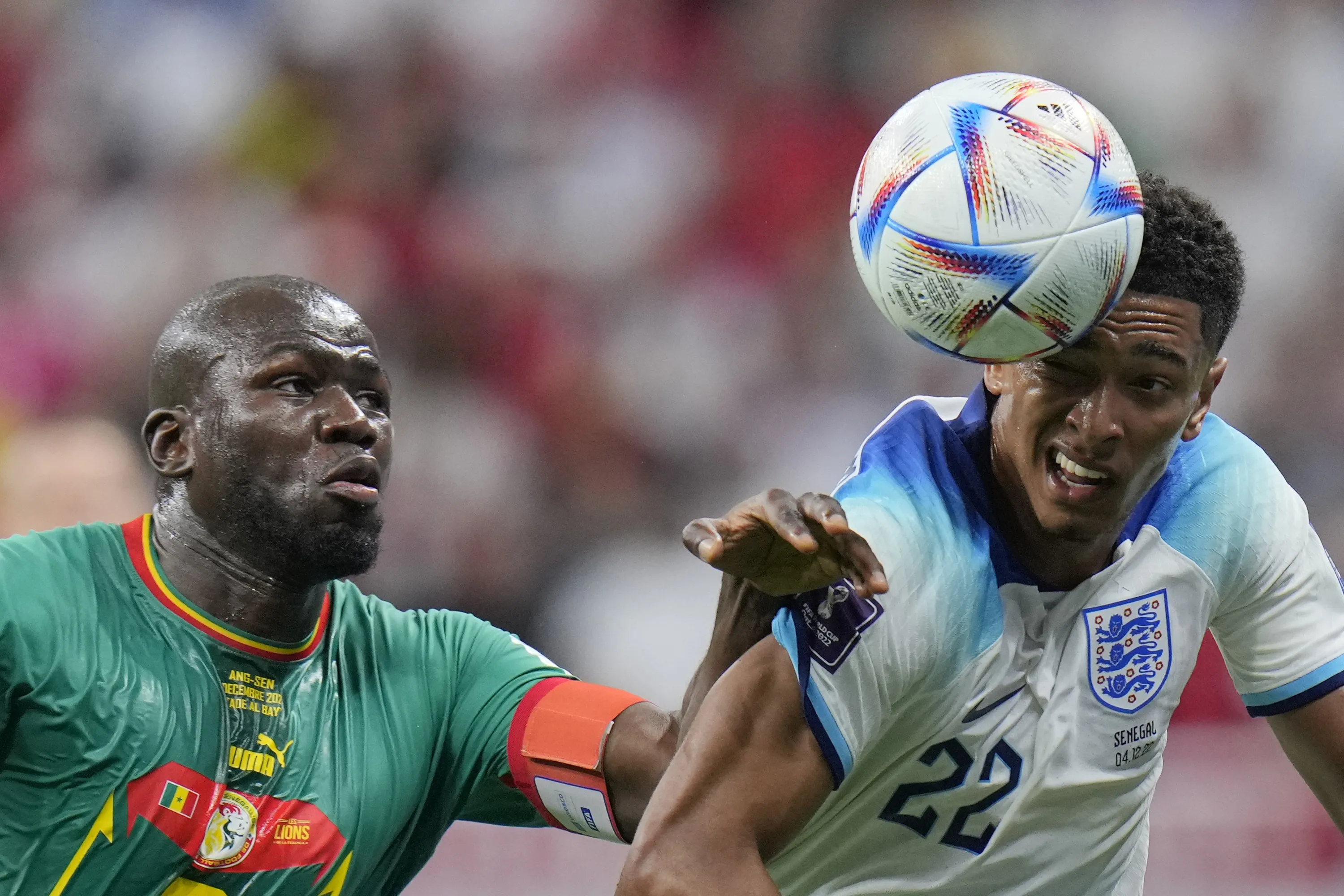 England's Jude Bellingham, right, challenges with Senegal's Kalidou Koulibaly during the World Cup round of 16 soccer match between England and Senegal, at the Al Bayt Stadium in Al Khor, Qatar, Sunday, December 4, 2022. (Photo by Hassan Ammar/AP Photo)
