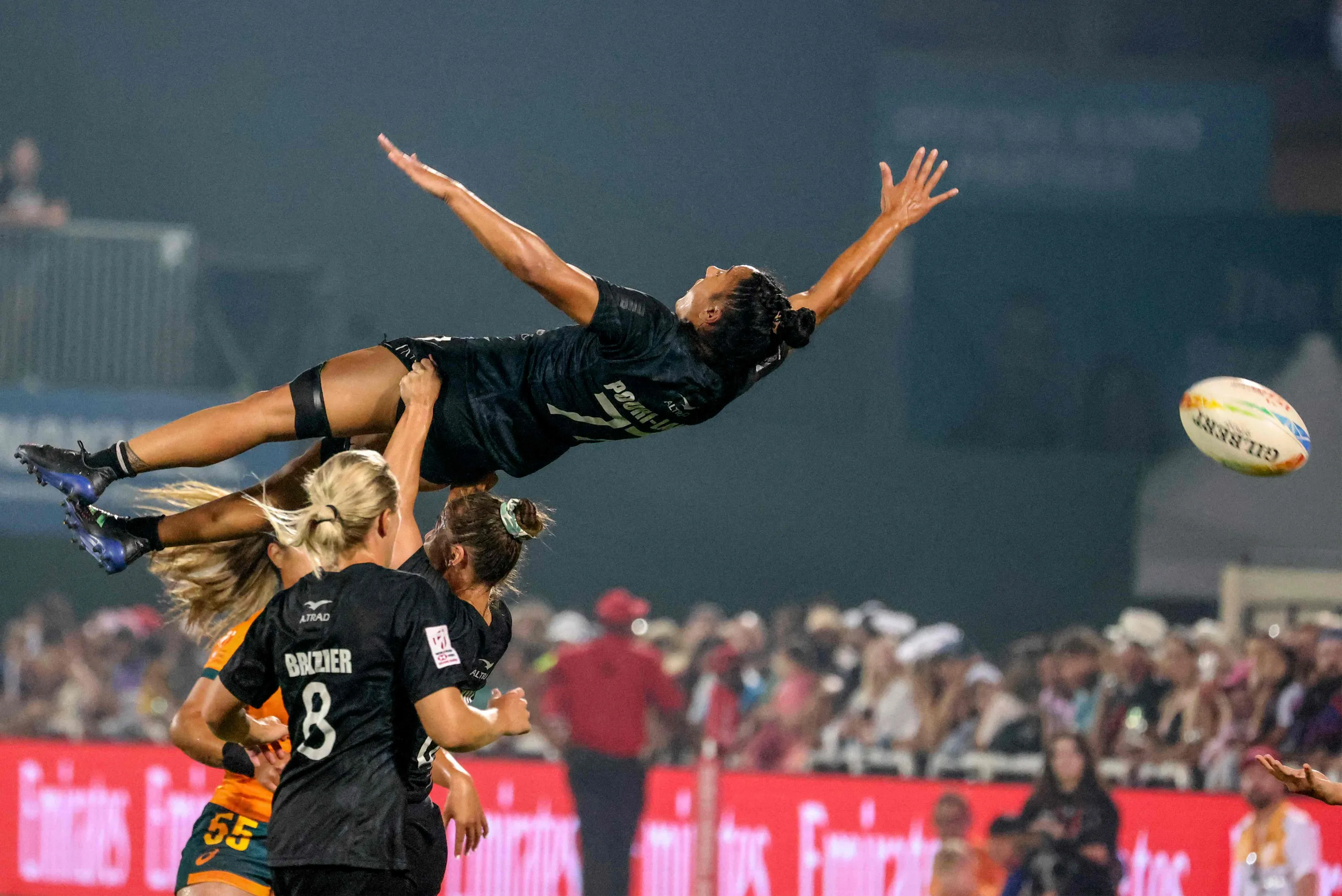 New Zealand's Risi Pouri-Lane jumps for the ball during the final of the HSBC World Rugby Sevens Series 2022 between Australia and New Zealand in the Gulf emirate of Dubai, on December 3, 2022. (Photo by Karim Sahib/AFP Photo)