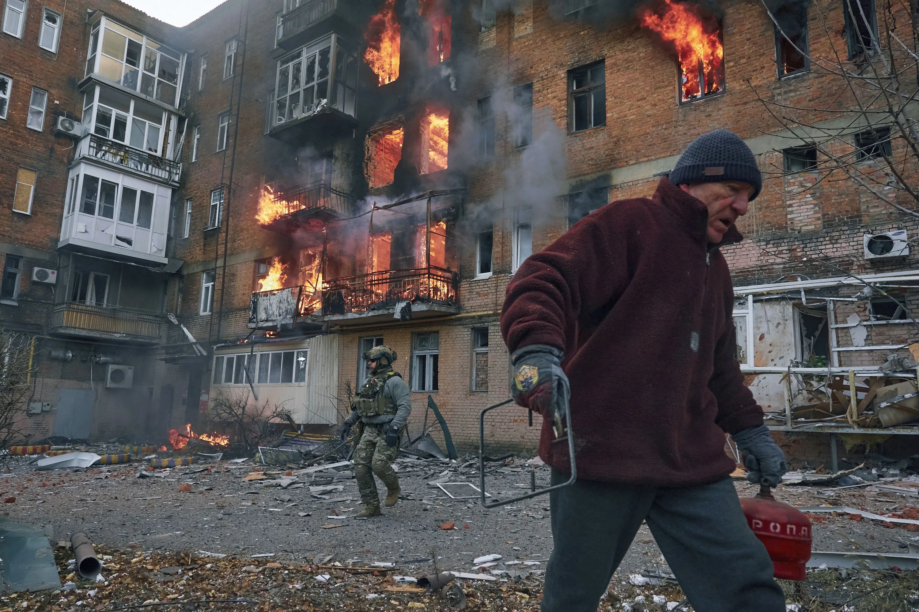 A local resident leaves his home after Russian shelling destroyed an apartment house in Bakhmut, Donetsk region, Ukraine, Wednesday, December 7, 2022. (Photo by LIBKOS/AP Photo)