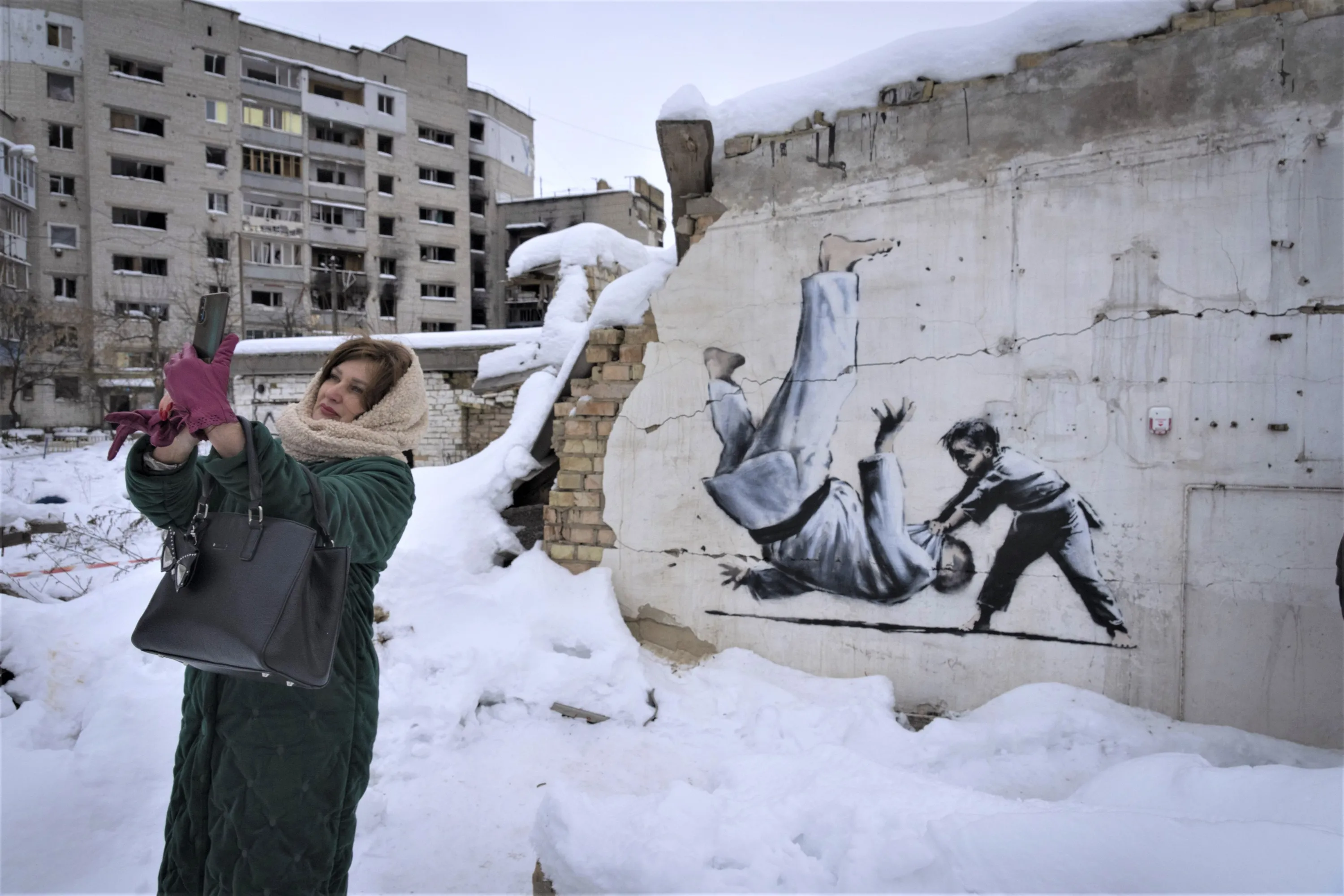 A woman takes a selfie at an artwork that was made by British street artist Banksy on a building destroyed by the Russian army in Borodyanka, Kyiv region, Ukraine, Tuesday, December 6, 2022. (Photo by Efrem Lukatsky/AP Photo)