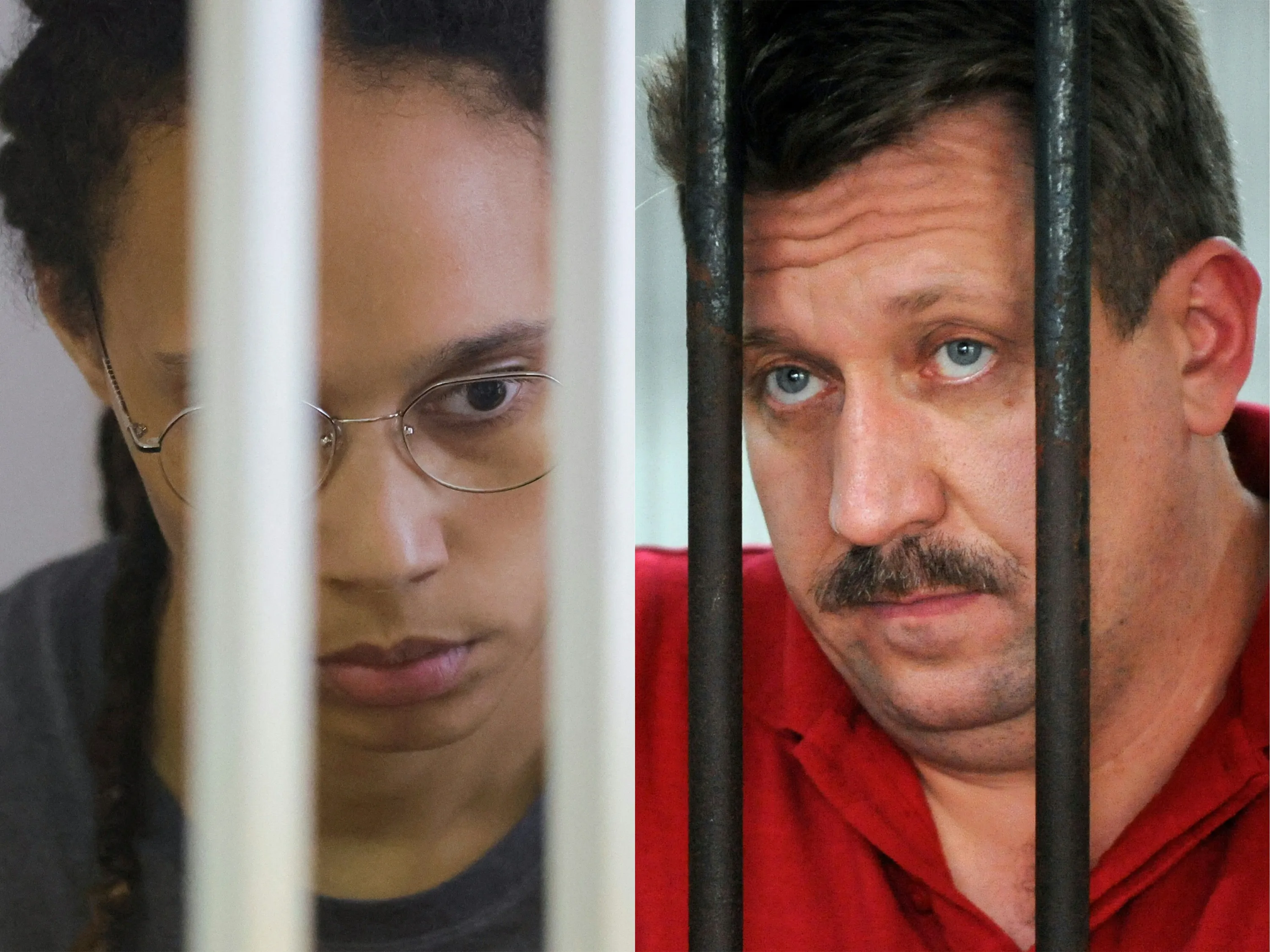 This combination of files pictures created on December 8, 2022 shows US' Women's National Basketball Association (WNBA) basketball player Brittney Griner waiting for the verdict inside a defendants' cage during a hearing in Khimki outside Moscow, on August 4, 2022 and Russian arms dealer Viktor Bout waiting at a detention center of criminal court in Bangkok, on March 8, 2008. Moscow confirmed on December 8, 2022 it had exchanged US basketball star Brittney Griner, who had been jailed in Russia, for notorious arms trafficker Victor Bout who was serving a 25-year sentence in the United States. (Photo by Evgenia Novozhenina and Saeed Khan/AFP Photo)