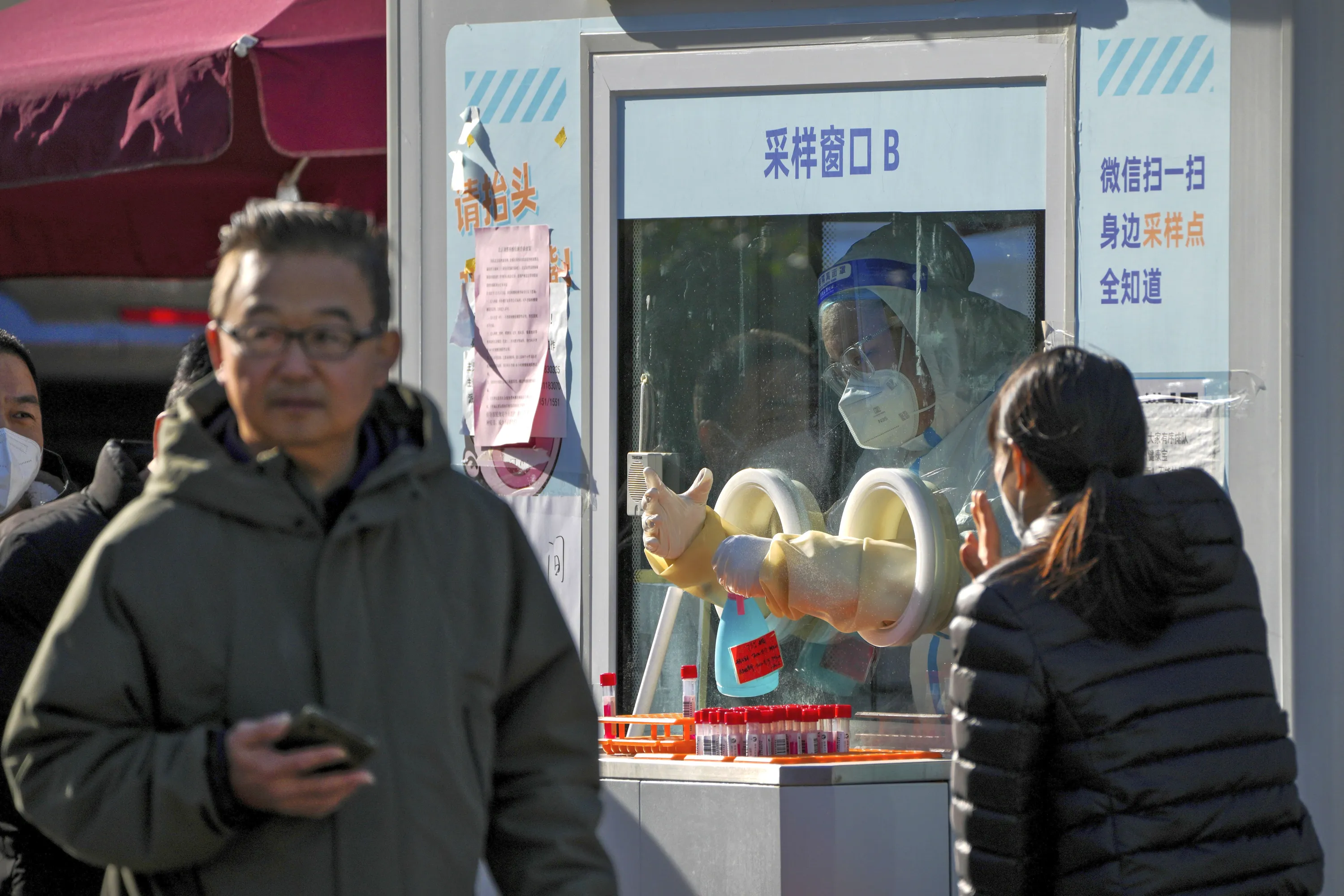 A worker in protective gear disinfects his gloves as residents get their routine COVID-19 throat swabs despite authorities starting to ease some of the anti-virus controls in Beijing, Thursday, December 8, 2022. China is the last major country still trying to stamp out transmission of the virus while many nations switch to trying to live with it. As they lift restrictions, Chinese officials have also shifted to talking about the virus as less threatening a possible effort to prepare people for a similar switch. (Photo by Andy Wong/AP Photo)