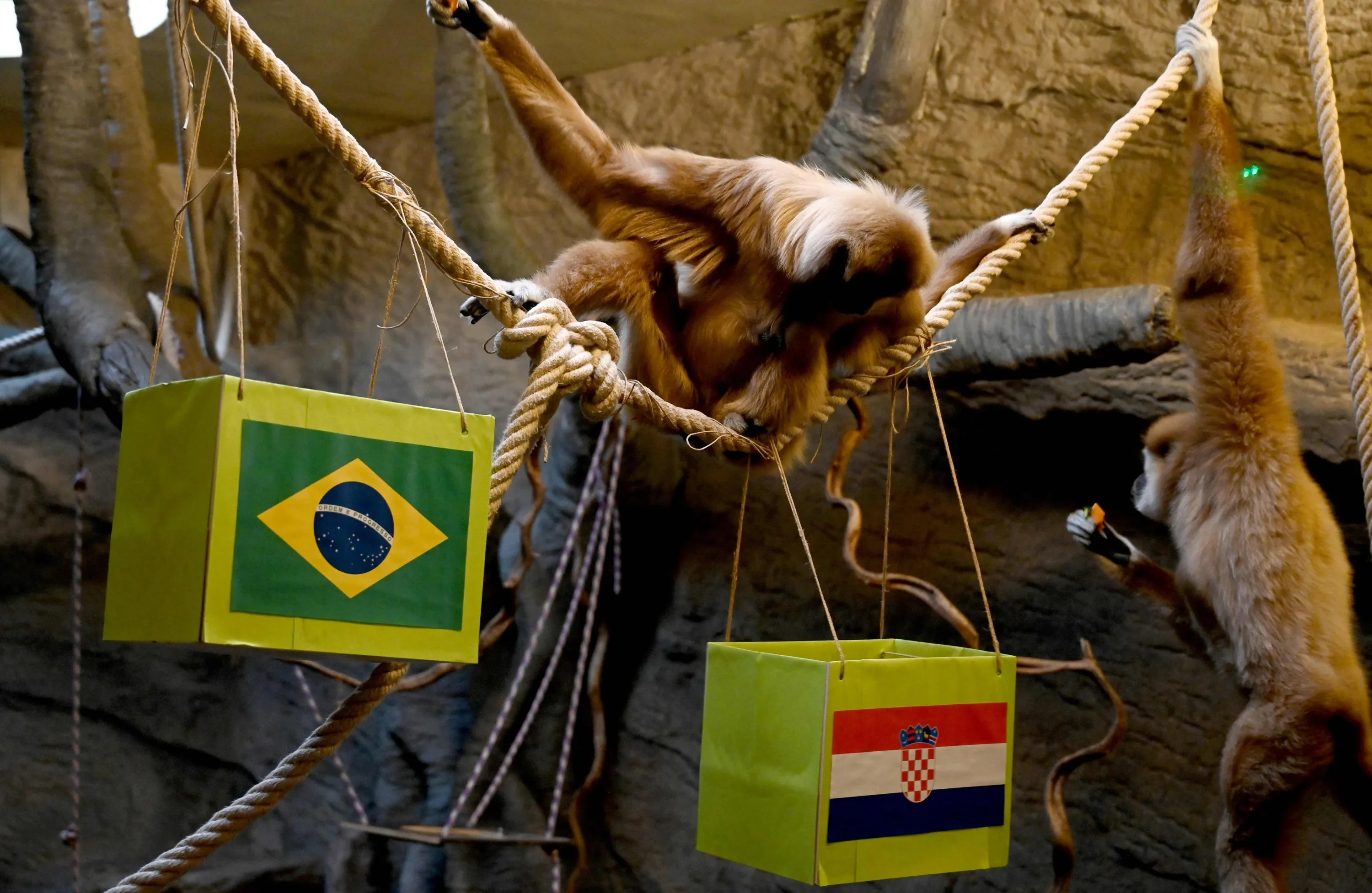Gibbon Kent and his pack choose food from one of the boxes depicting flags of Croatia (R) and Brazil at the Zagreb Zoo on December 9, 2022, to predict the winner of the Qatar 2022 World Cup quarter final football match between Brazil and Croatia. (Photo by Denis Lovrovic/AFP Photo)