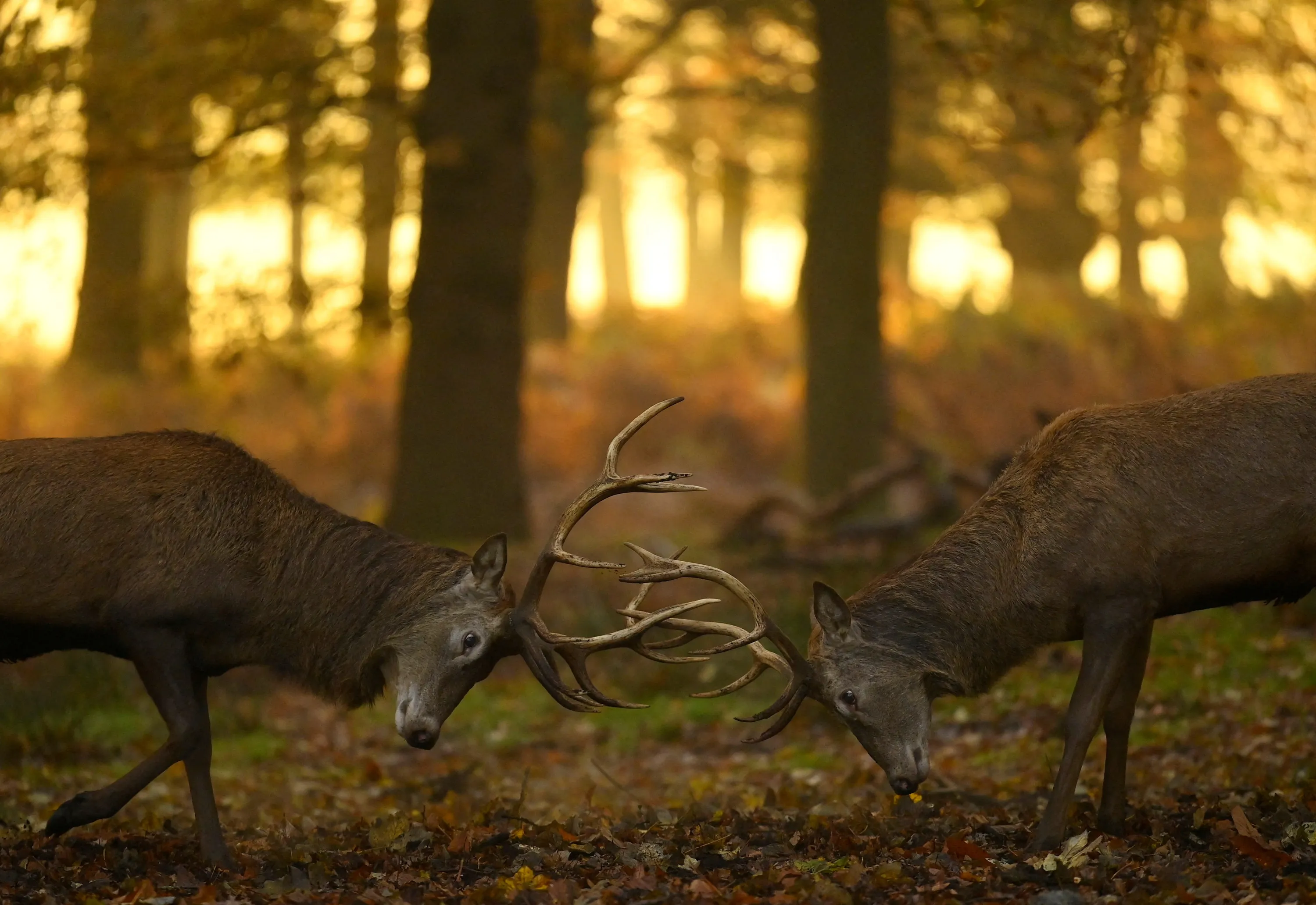 Deer stags clash antlers as the rutting season continues, in Richmond Park, London, Britain on December 1, 2022. (Photo by Toby Melville/Reuters)