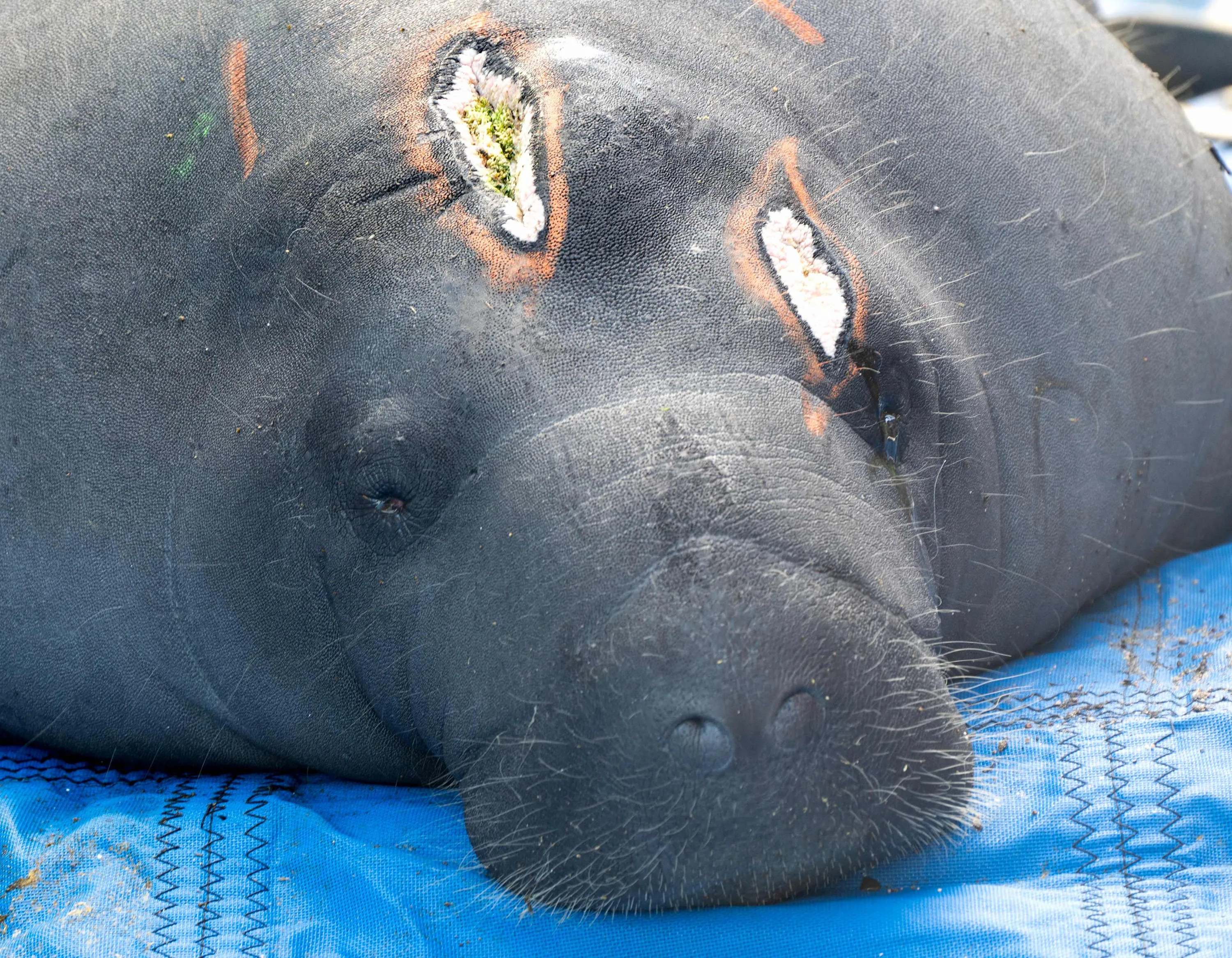This handout photo released by the Florida Keys News Bureau shows an unnamed 1,295-pound rehabilitated male manatee with healed head wounds resting before being released back to Florida Keys waters, November 29, 2022, in Key Colony Beach, Florida. - The adult male, measuring nearly 11 feet long, was rescued in April 2022 after a boat strike that caused propeller wounds across its head. Following rehabilitation, the marine mammal was released with two other rehabilitated manatees November 29 in the Florida Keys. (Photo by Andy Newman/Florida Keys News Bureau/AFP Photo)
