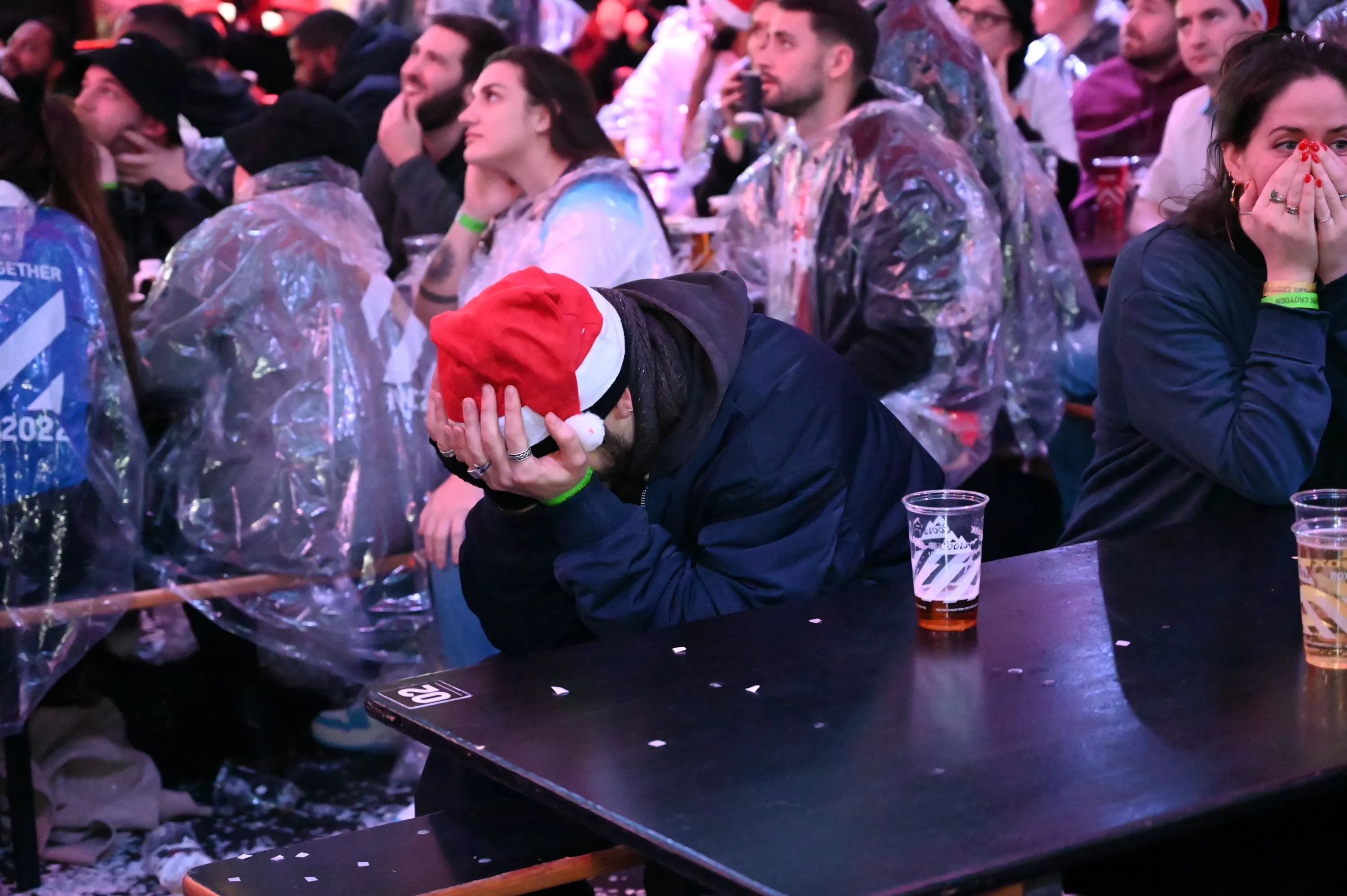 England fans react after watching the England-France World Cup quarterfinal match at Boxpark Croydon on December 10, 2022 in London, England. The winner of the match will face Morocco in the semifinals. (Photo by Jamie Lashmar/Story Picture Agency)