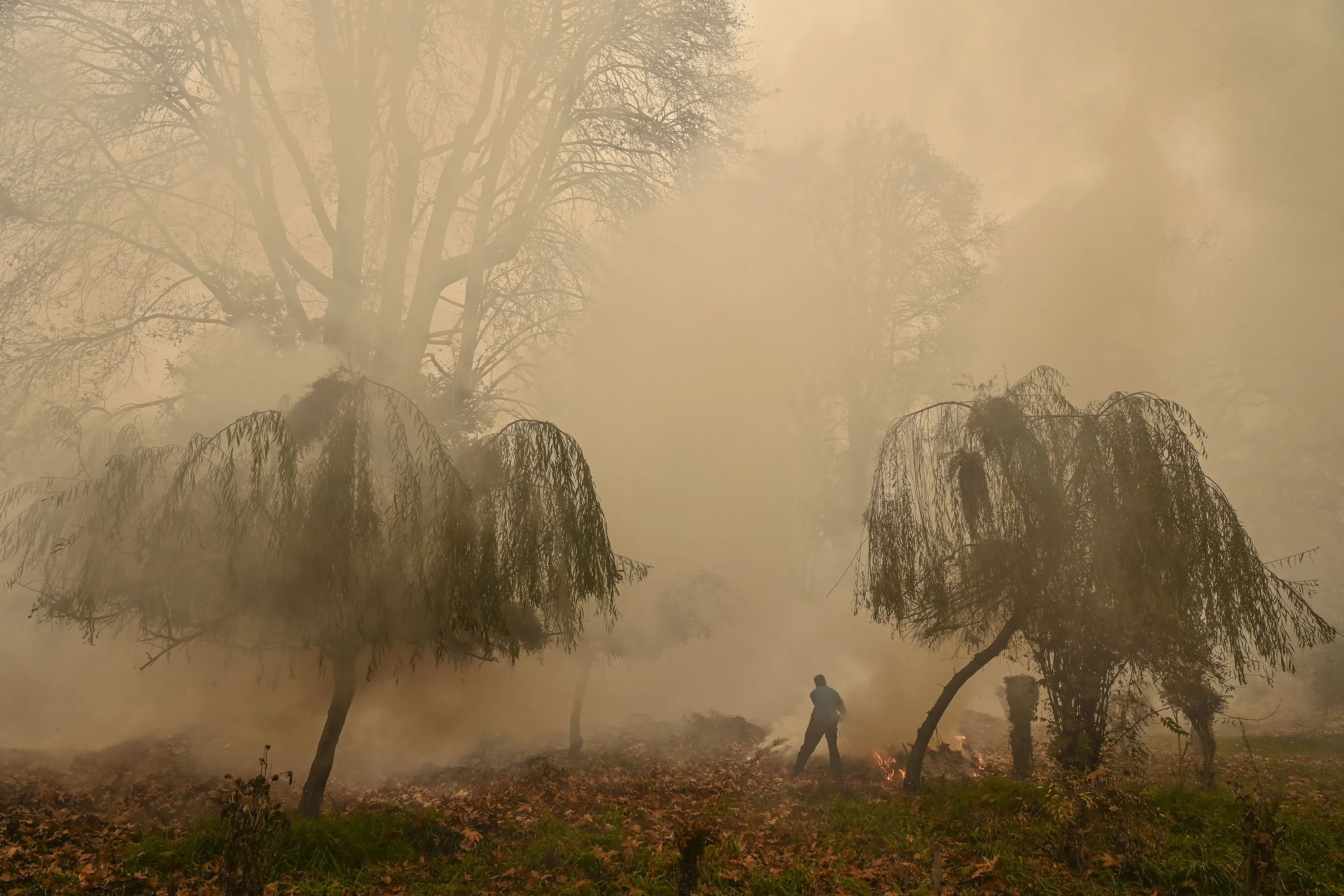 A man burns tree leaves to make charcoal at a park in Srinagar on December 6, 2022. (Photo by Tauseef Mustafa/AFP Photo)